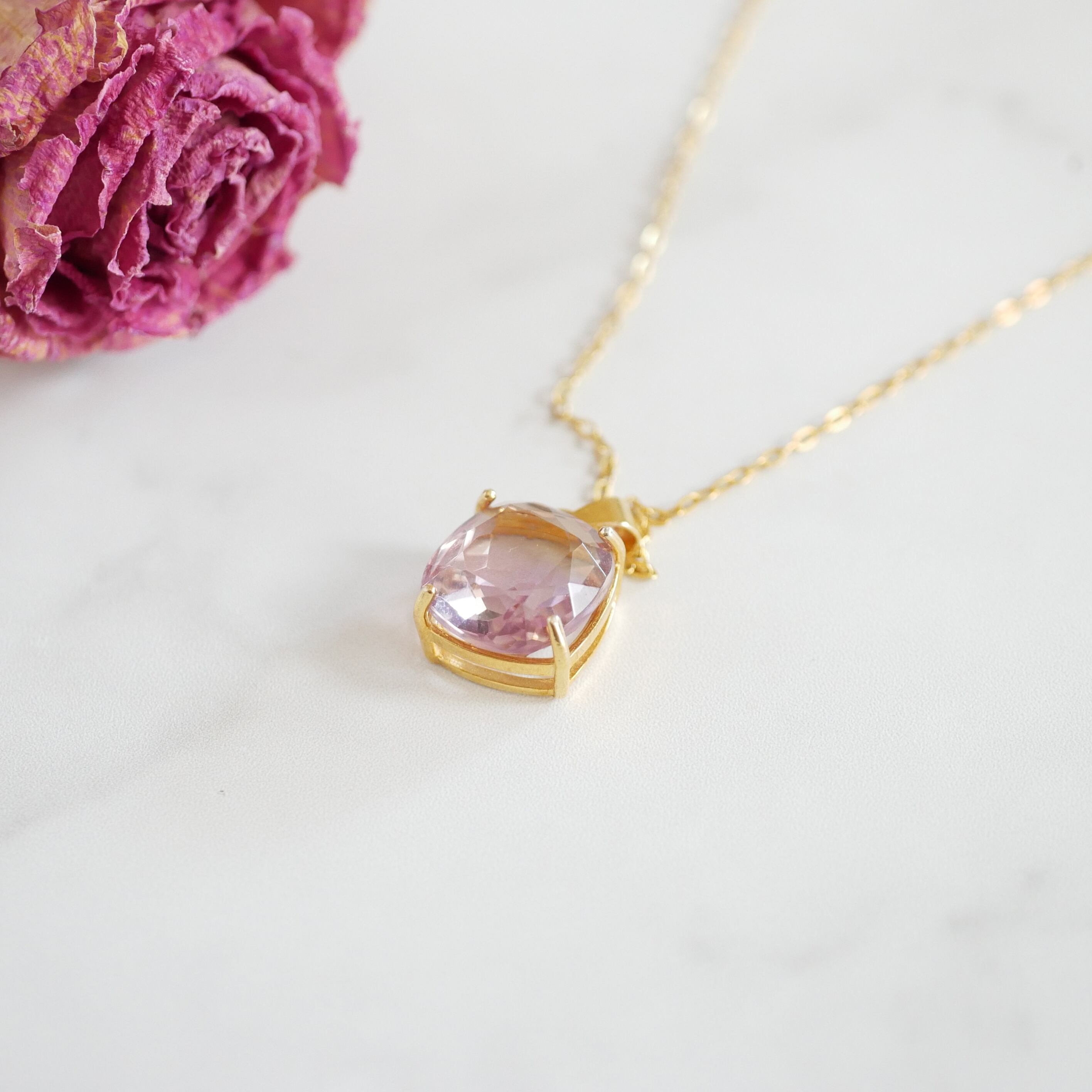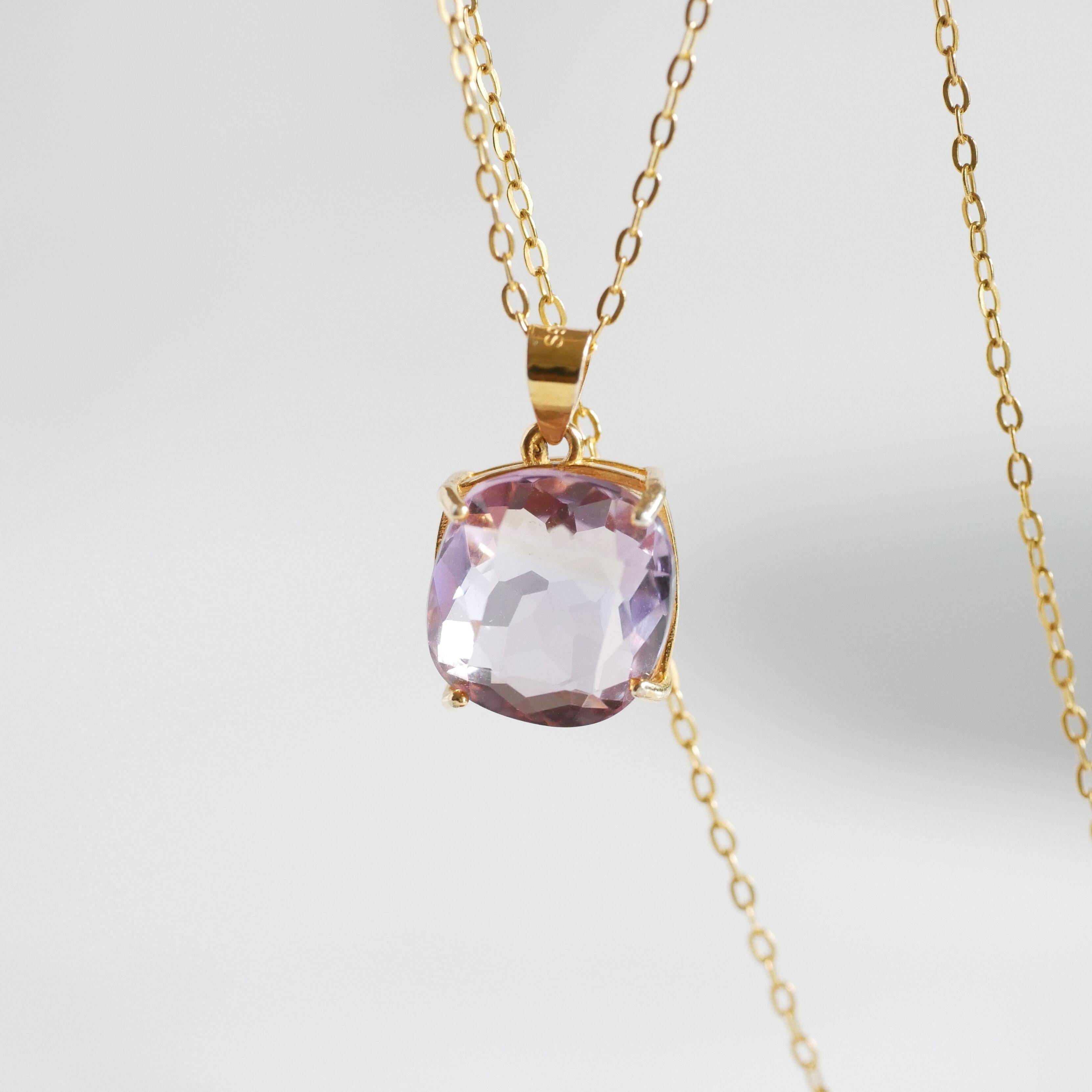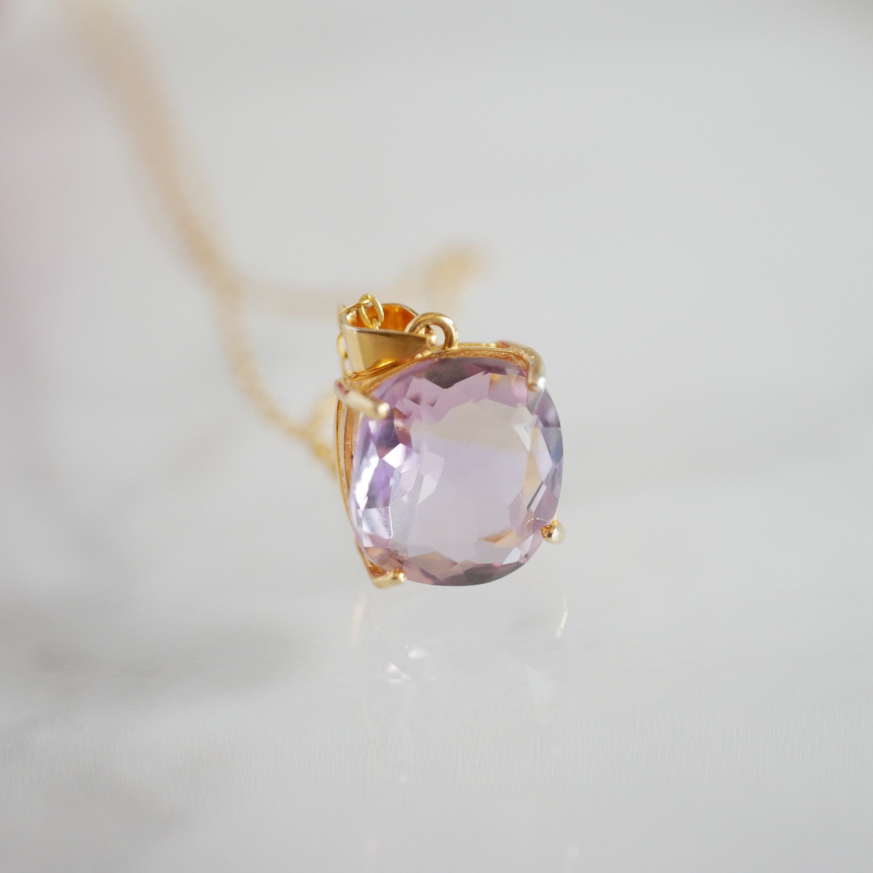上品で大人可愛いバイカラーアメトリンのスクエア(クッション型)ネックレスです。素晴らしい透明感と立体感で、胸元を明るく照らします。
