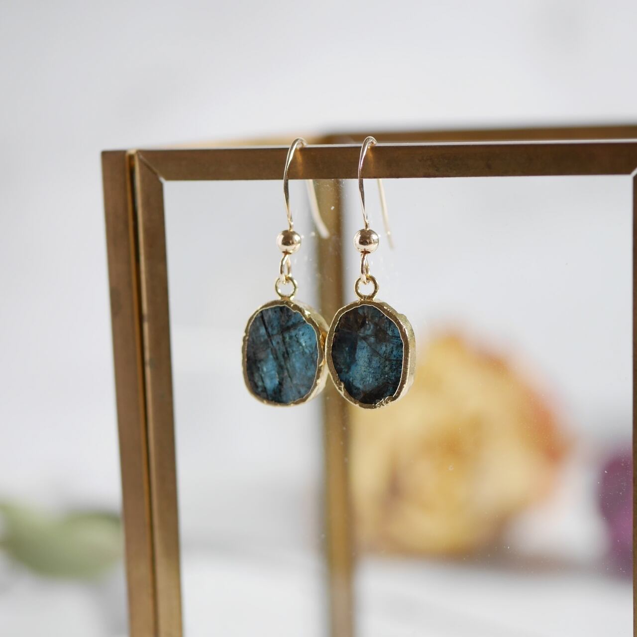 ブラジル産ディープブルーカイヤナイトのオーバル型ピアスです。岩石らしいゴツゴツ感を活かし、天然石に直接施されたゴールドコーティング枠が印象的。とてもモダンなデザインです。