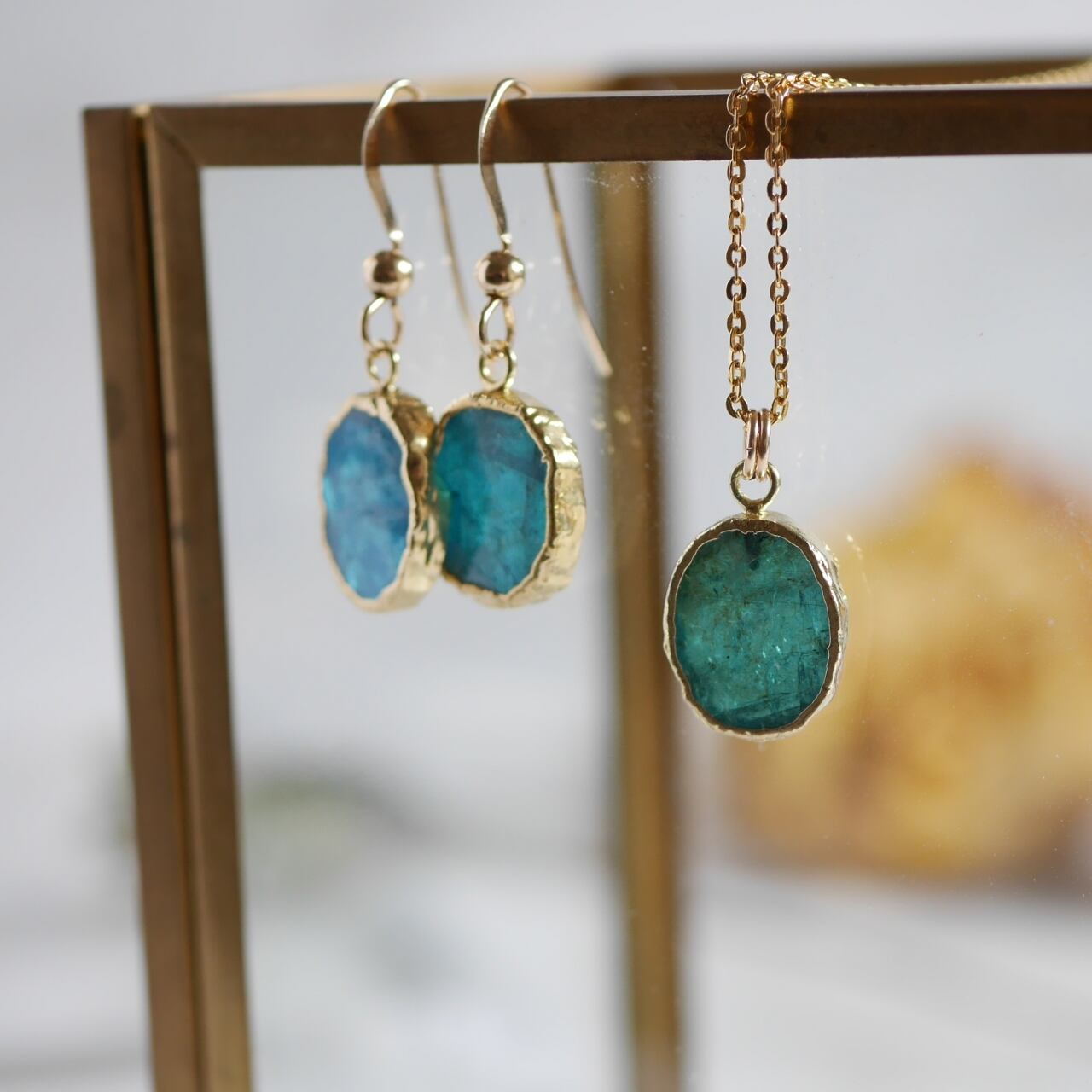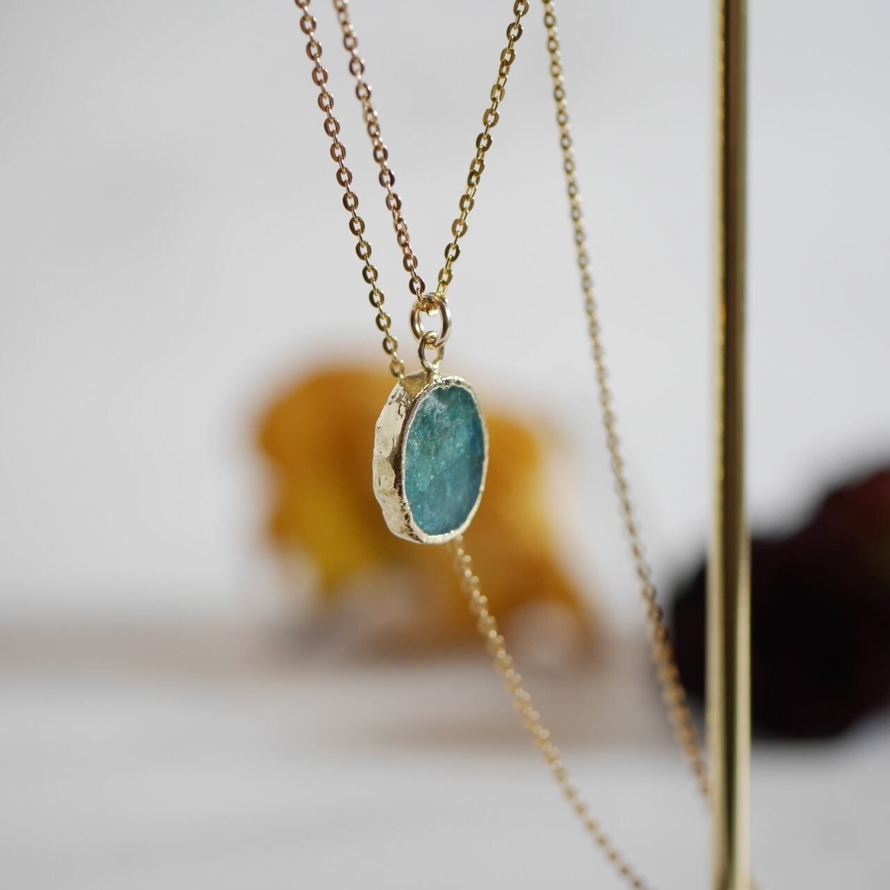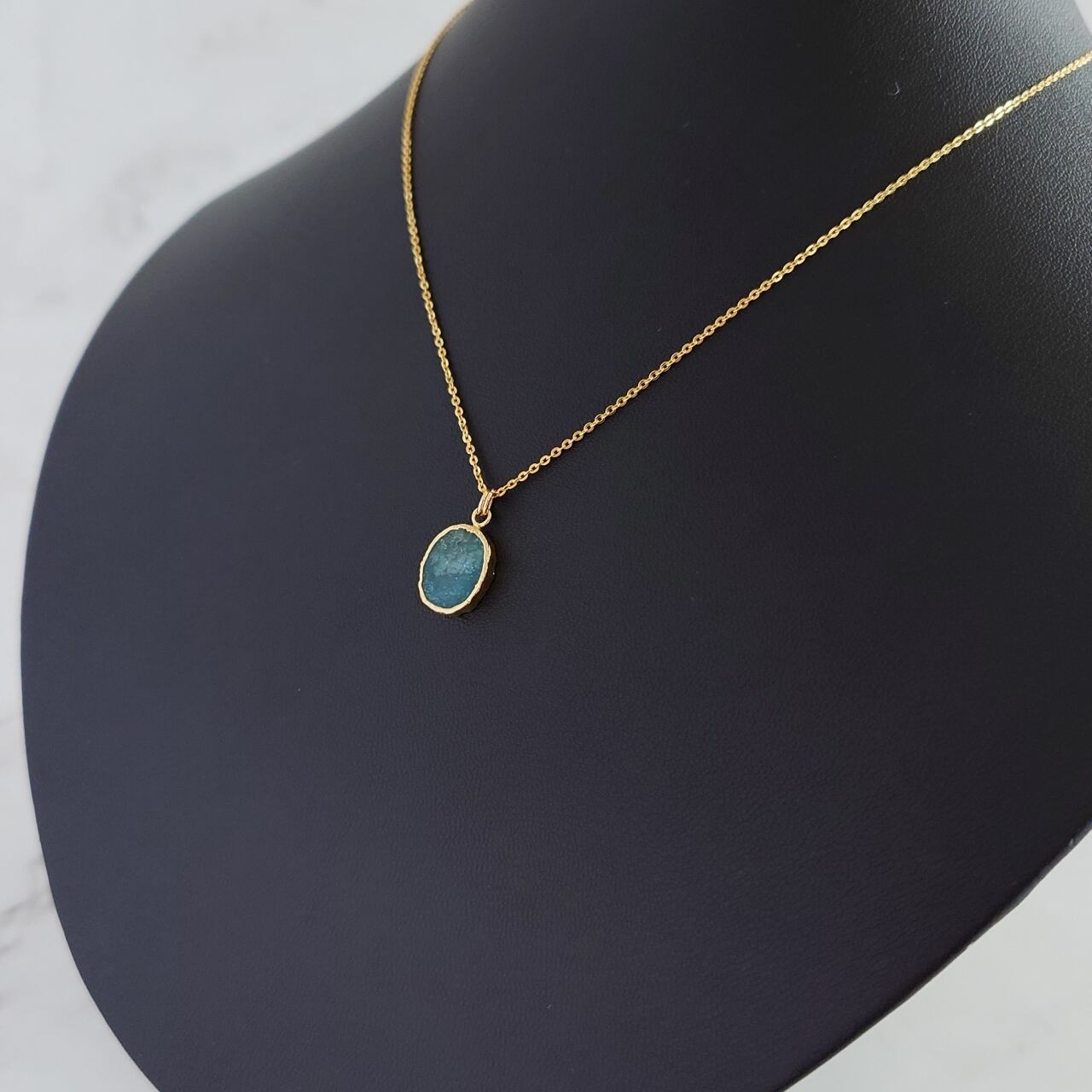 ブルーアパタイトのオーバル型ネックレスです。岩石らしいゴツゴツ感を活かし、天然石に直接施されたゴールドコーティング枠が印象的。とてもモダンなデザインです。