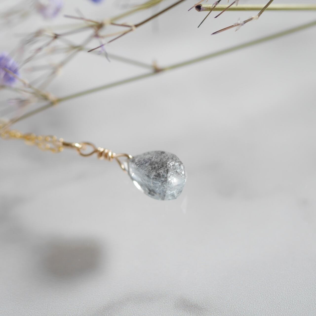 ナイジェリア産、モスアクアマリンのネックレスです。 アクアマリンの透明感のある落ち着いた色合いに、特有のインクルージョン(内包物)が浮かび上がる特別なひと品。