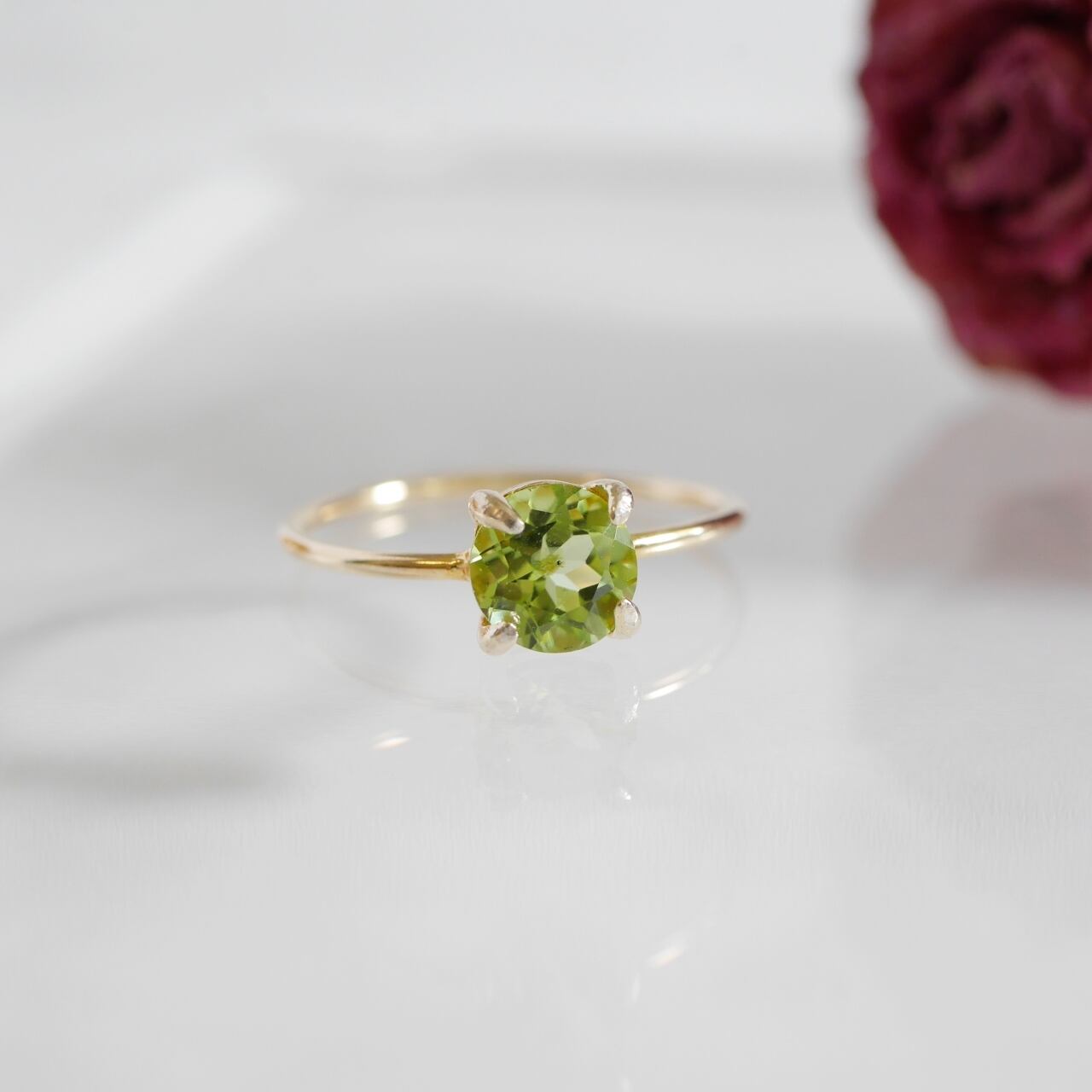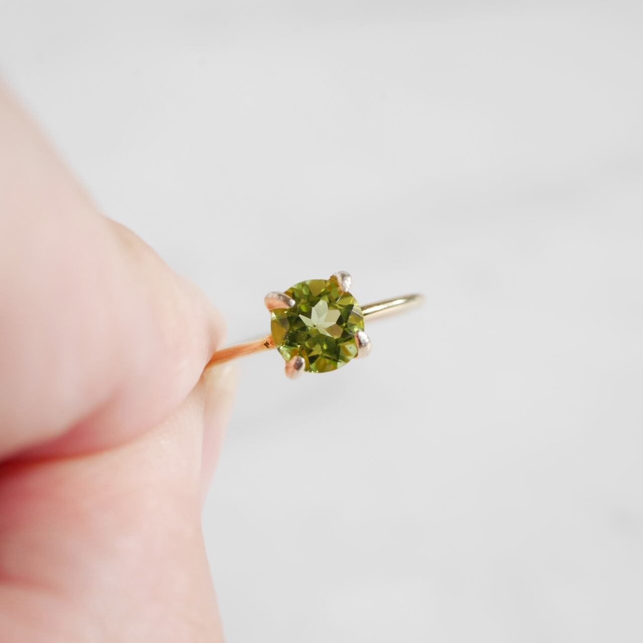 アリゾナ産ファセットカットの宝石質ペリドットを使用し、シンプルなラウンドリングに仕上げました。
