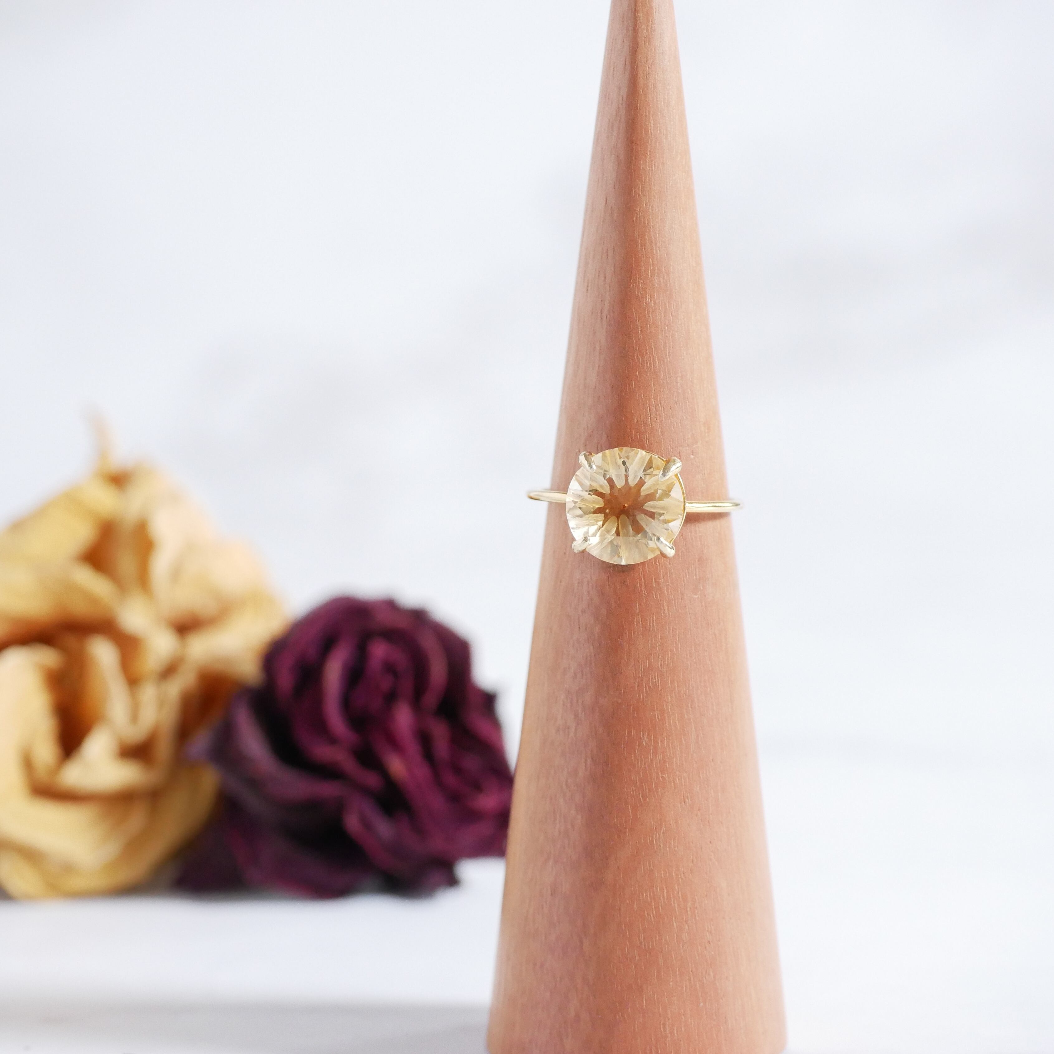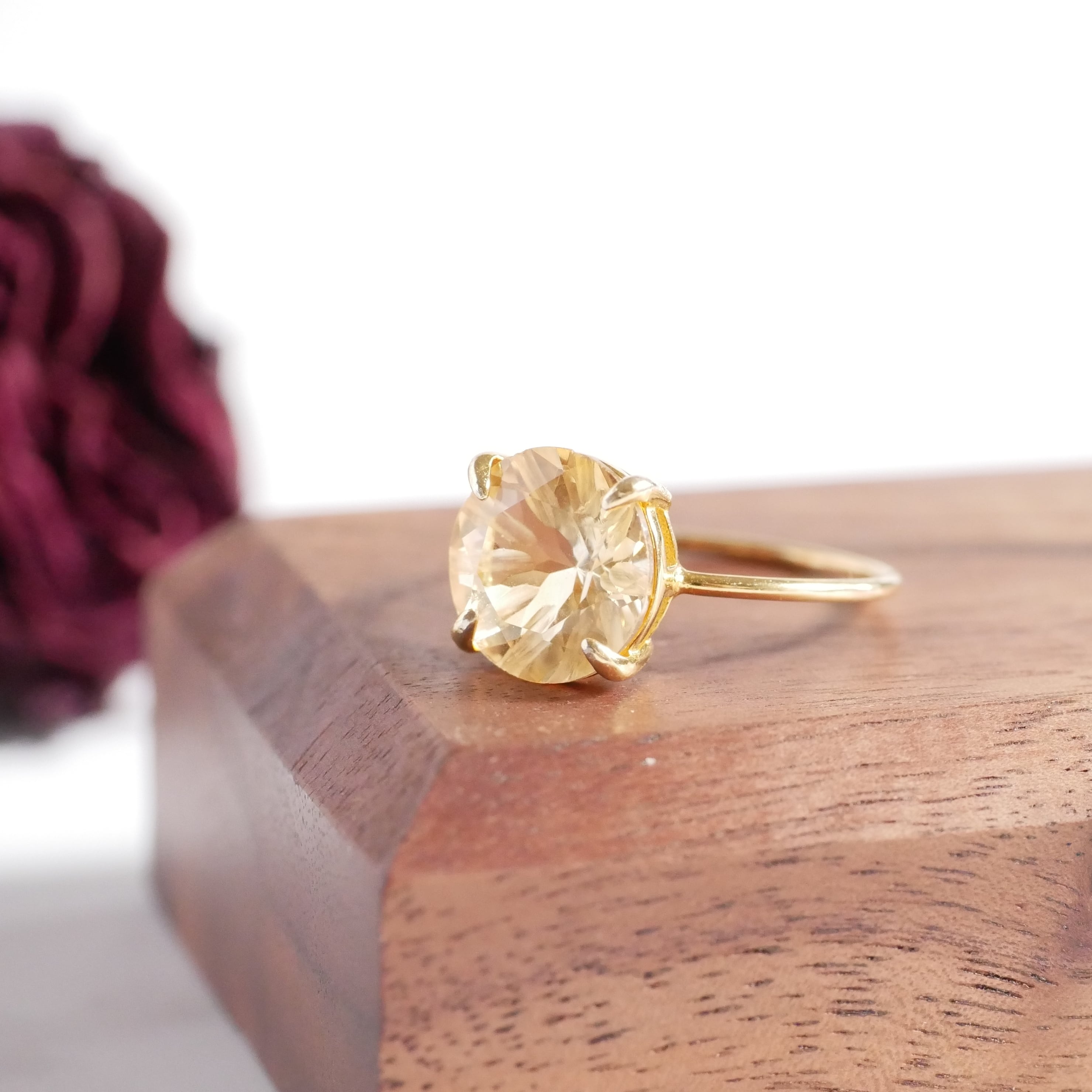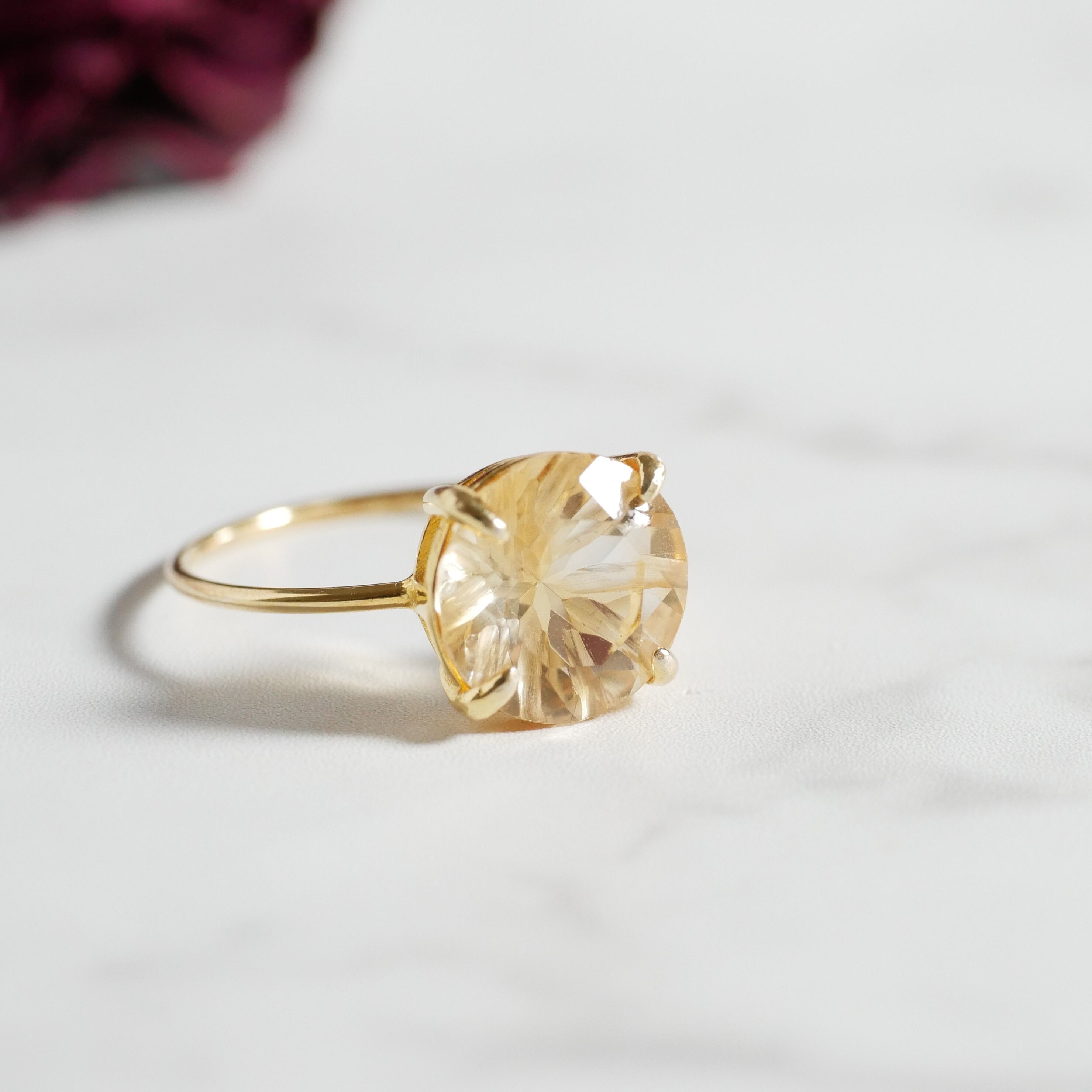 宝石質シトリンのリングです。彫刻入りファセットカットで奥行のあるデザイン。エレガントでフェミニンなテイストです。とても透明感のあるシトリンで、輝きが豊かです。