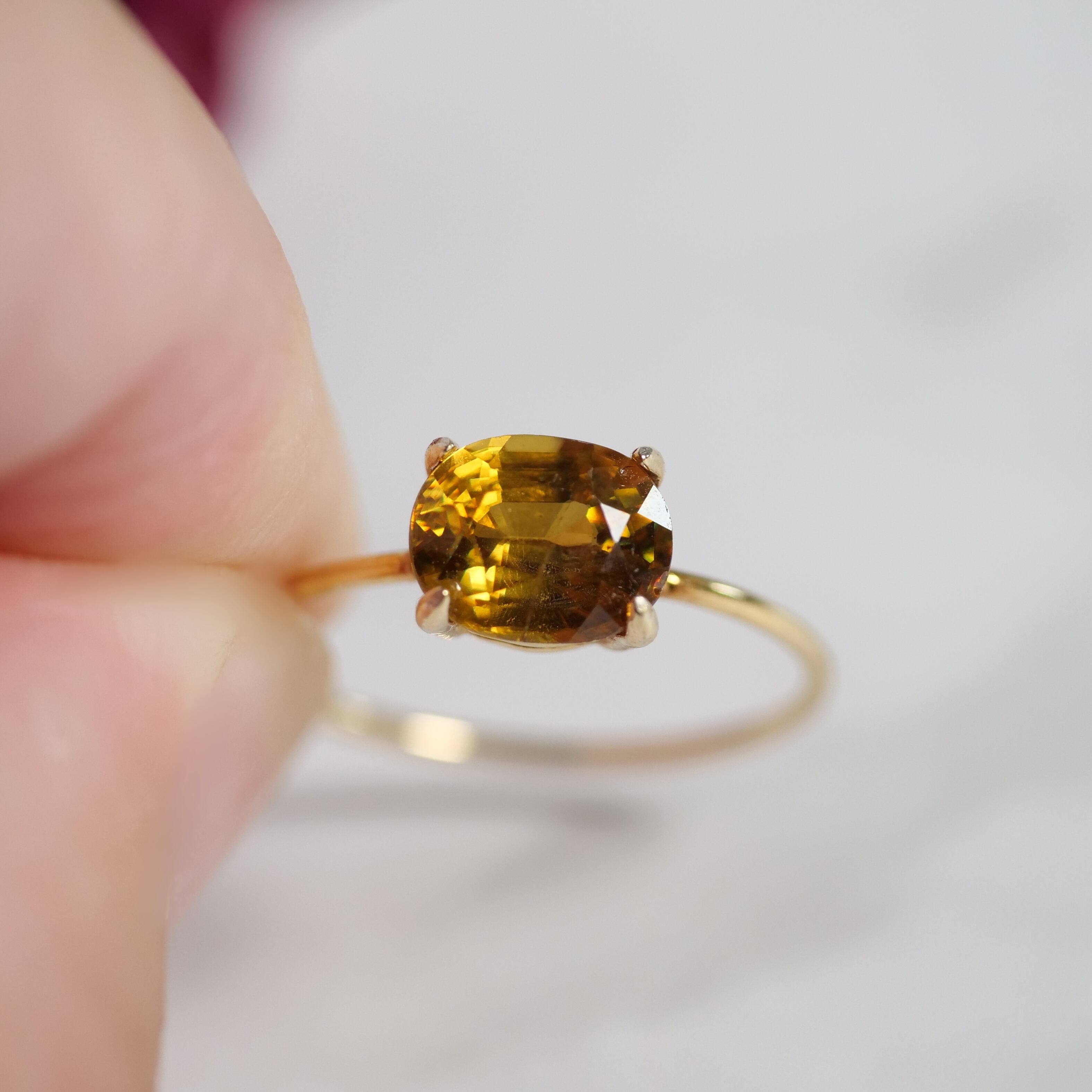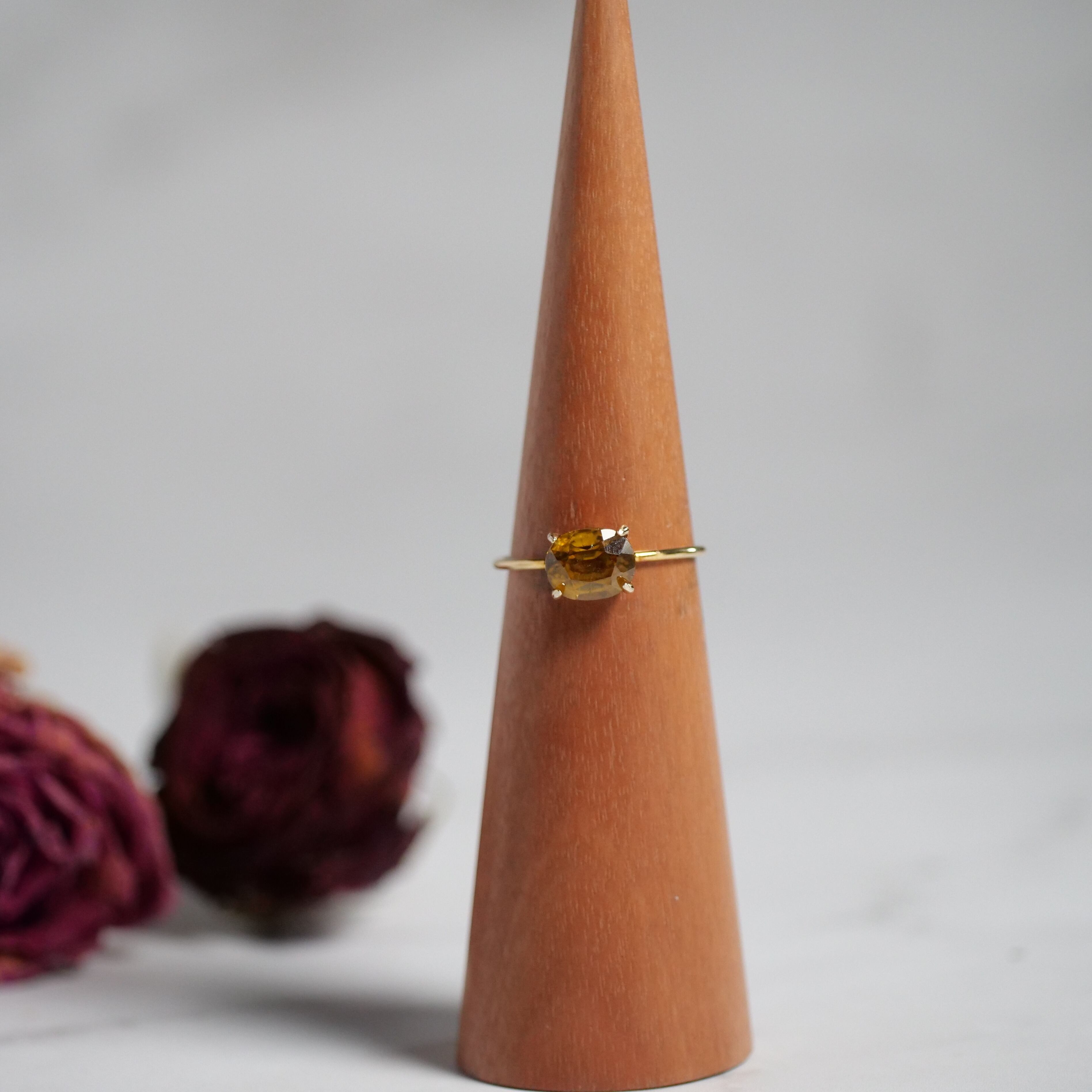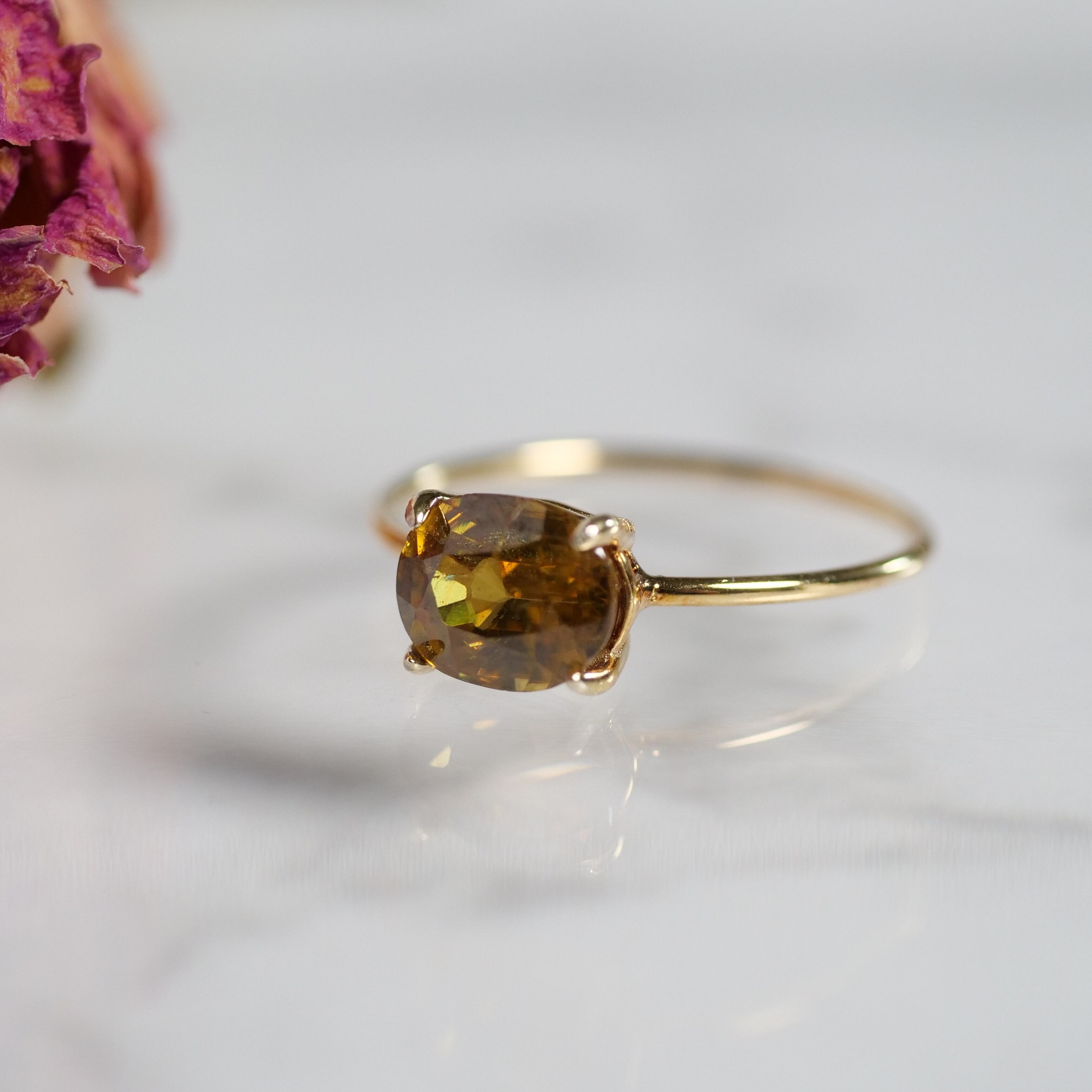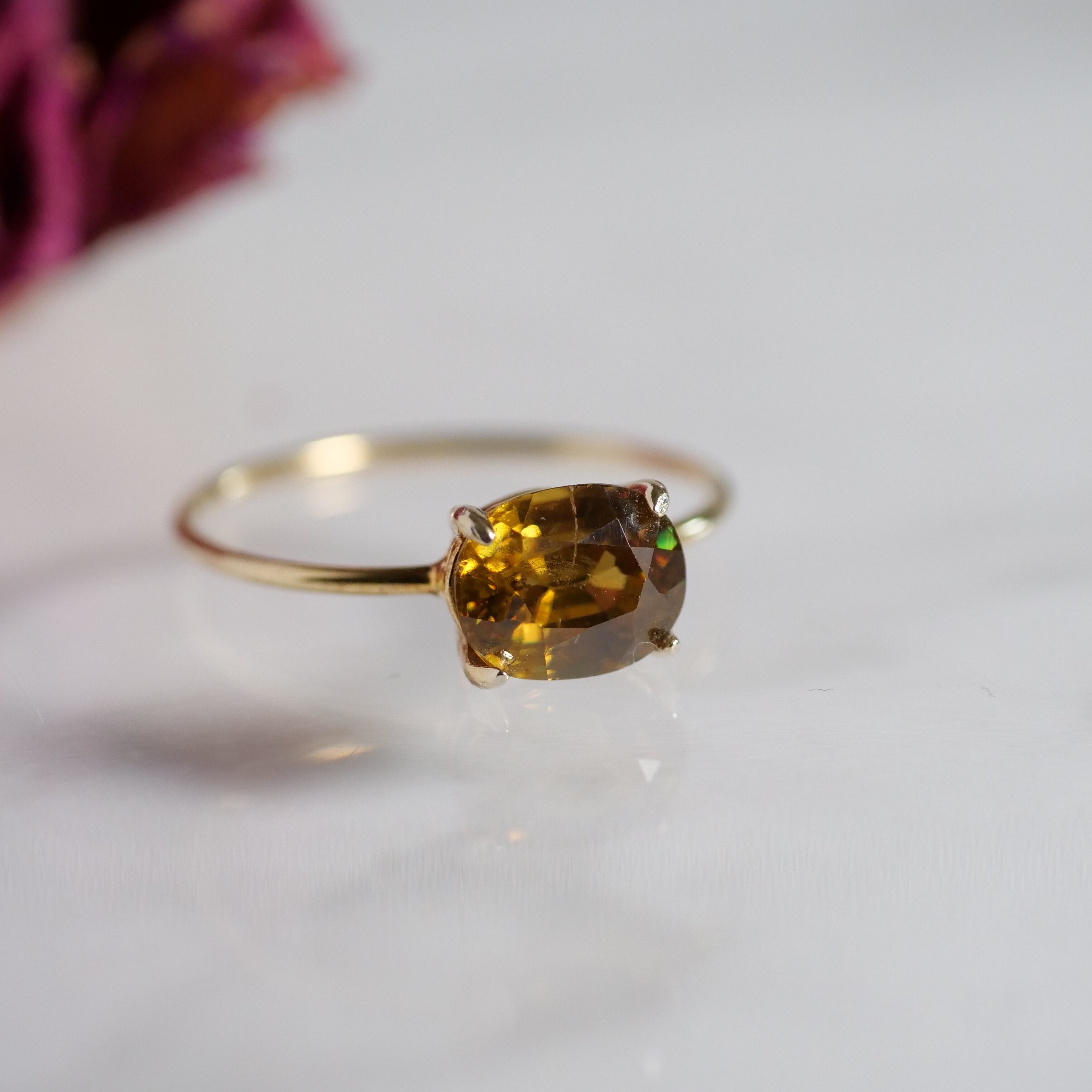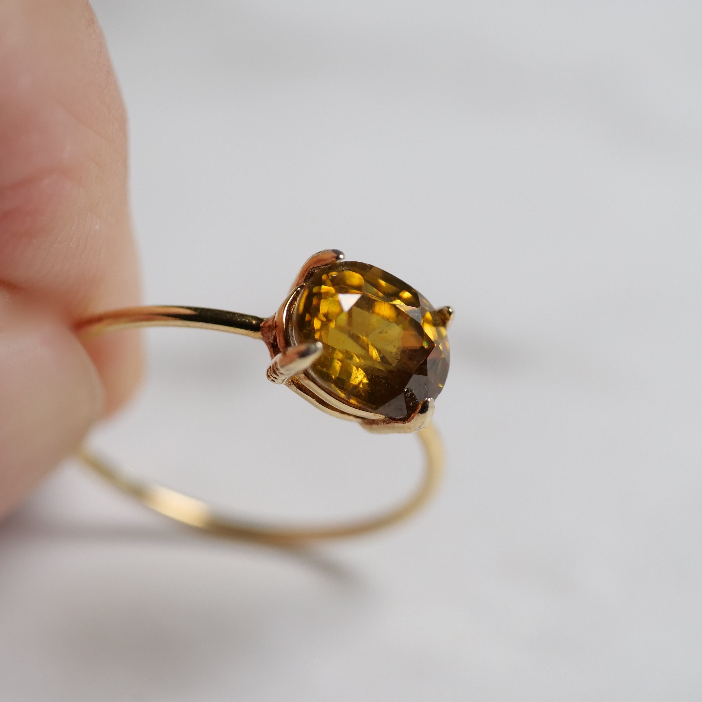 高貴で温かみのあるゴールドの輝きを基調とし、豪華なホログラム調のキラメキ(ファイア)を放つ、マダガスカル産スフェーンのリングです。