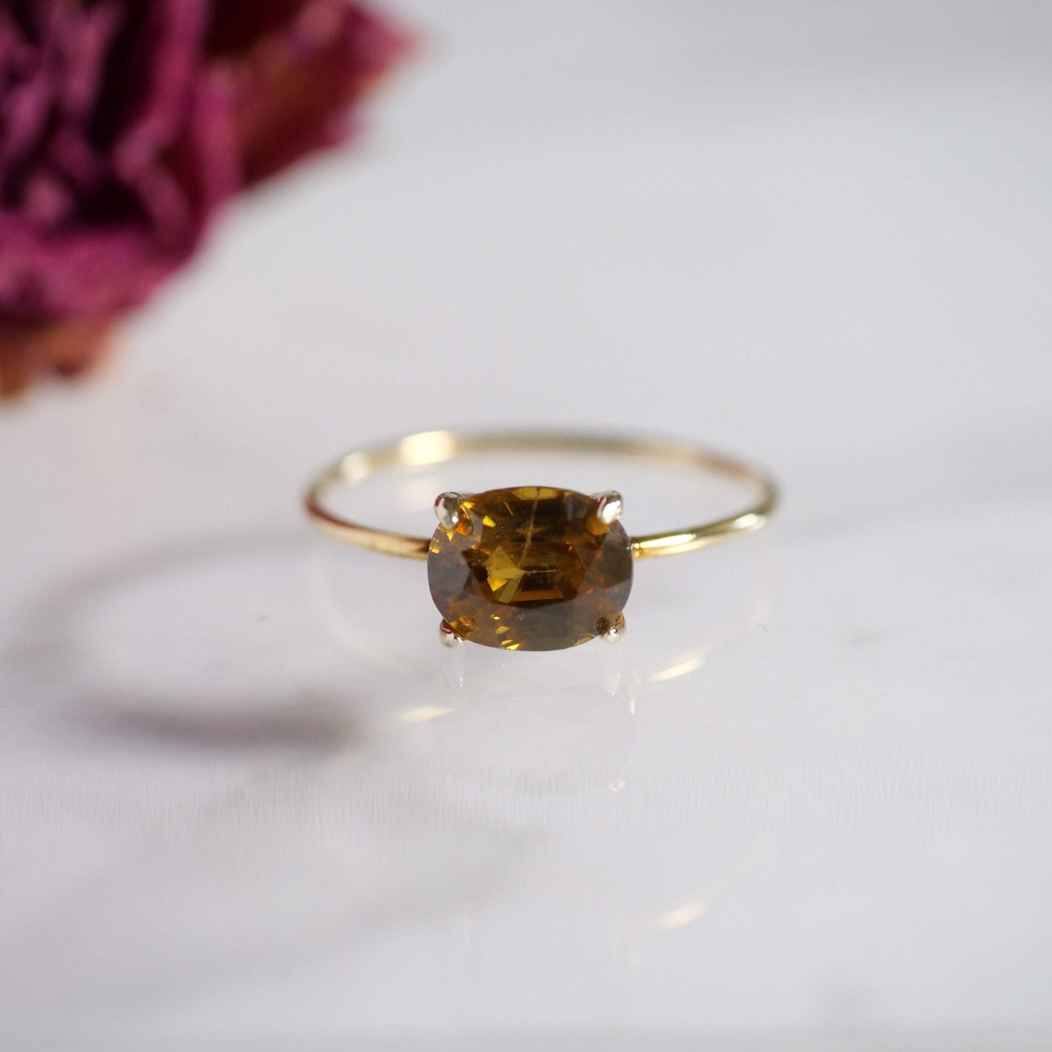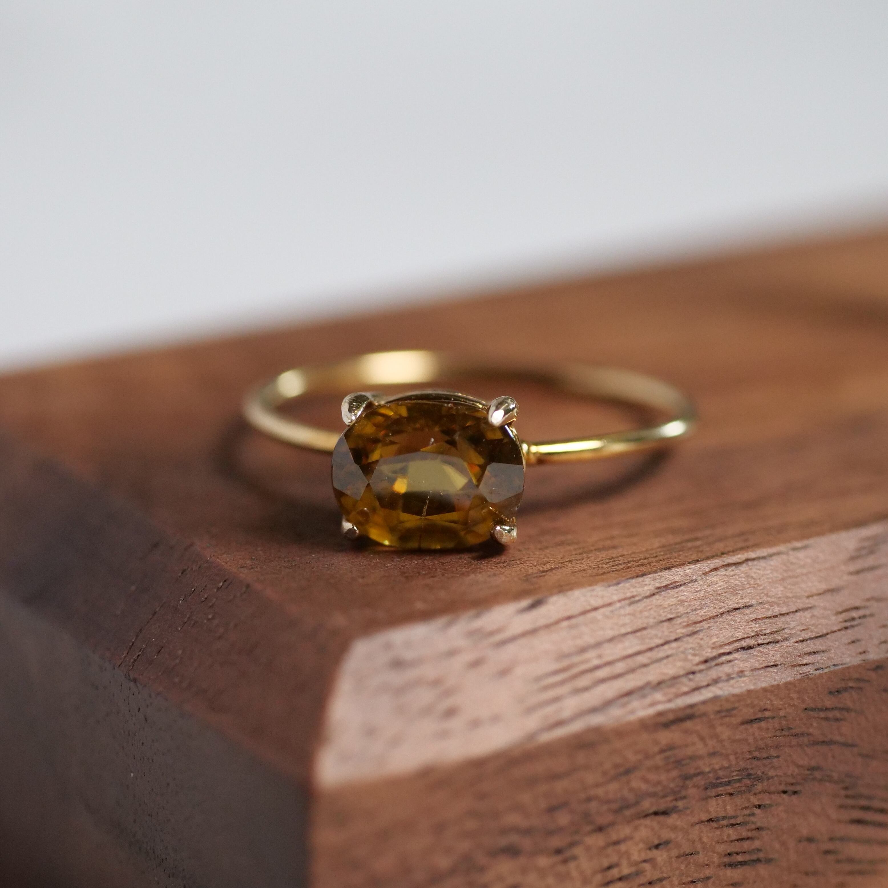 スフェーン本来の美しさを楽しんでいただけるように、天然石の表情と迫力に焦点を当てて、あえて華奢な台座を使い、シンプルなデザインリングに仕上げております。トレンドに左右されず、幅広い年代の方に末永くお使いいただけるスフェーンリングです。1点物、オーバル型でエレガントなシルエットです。