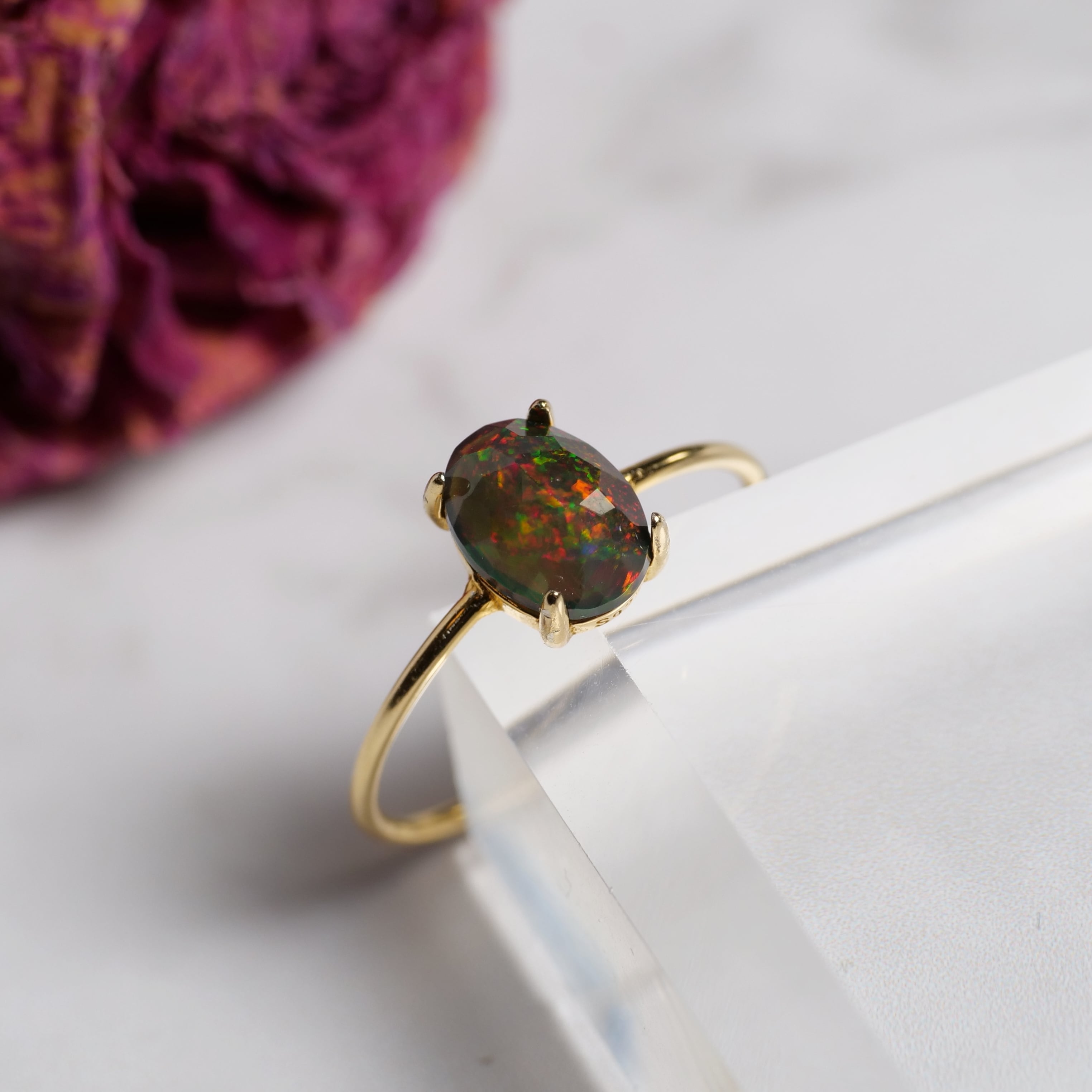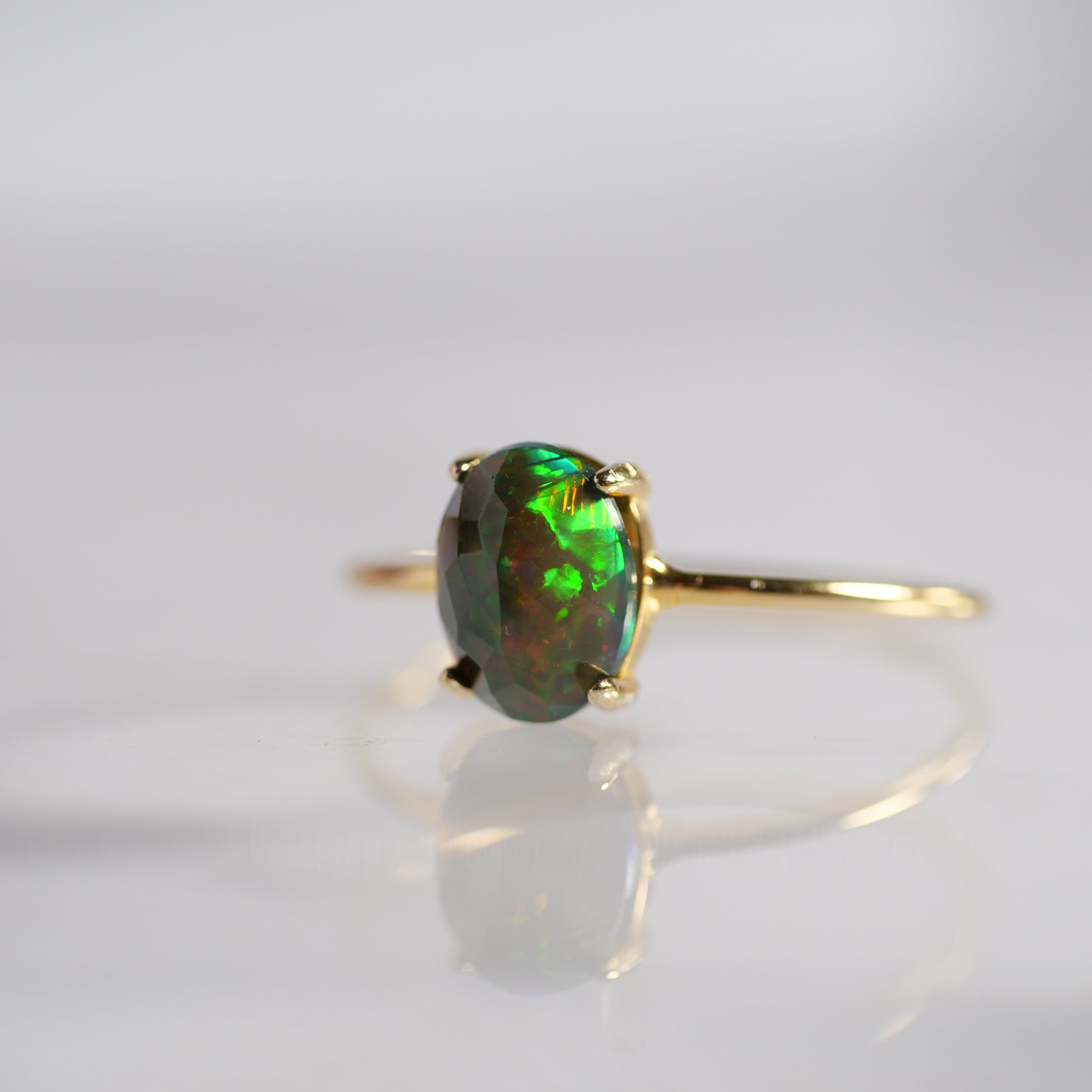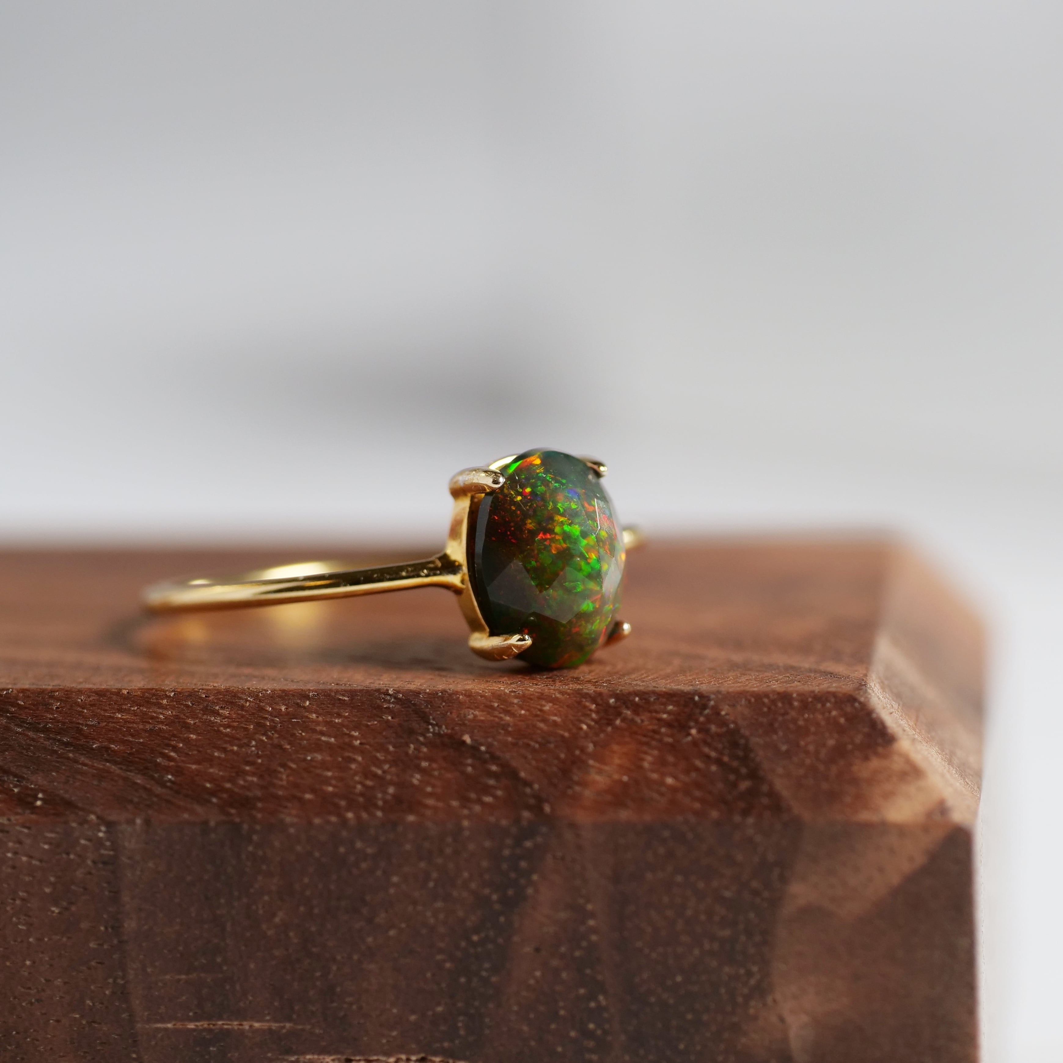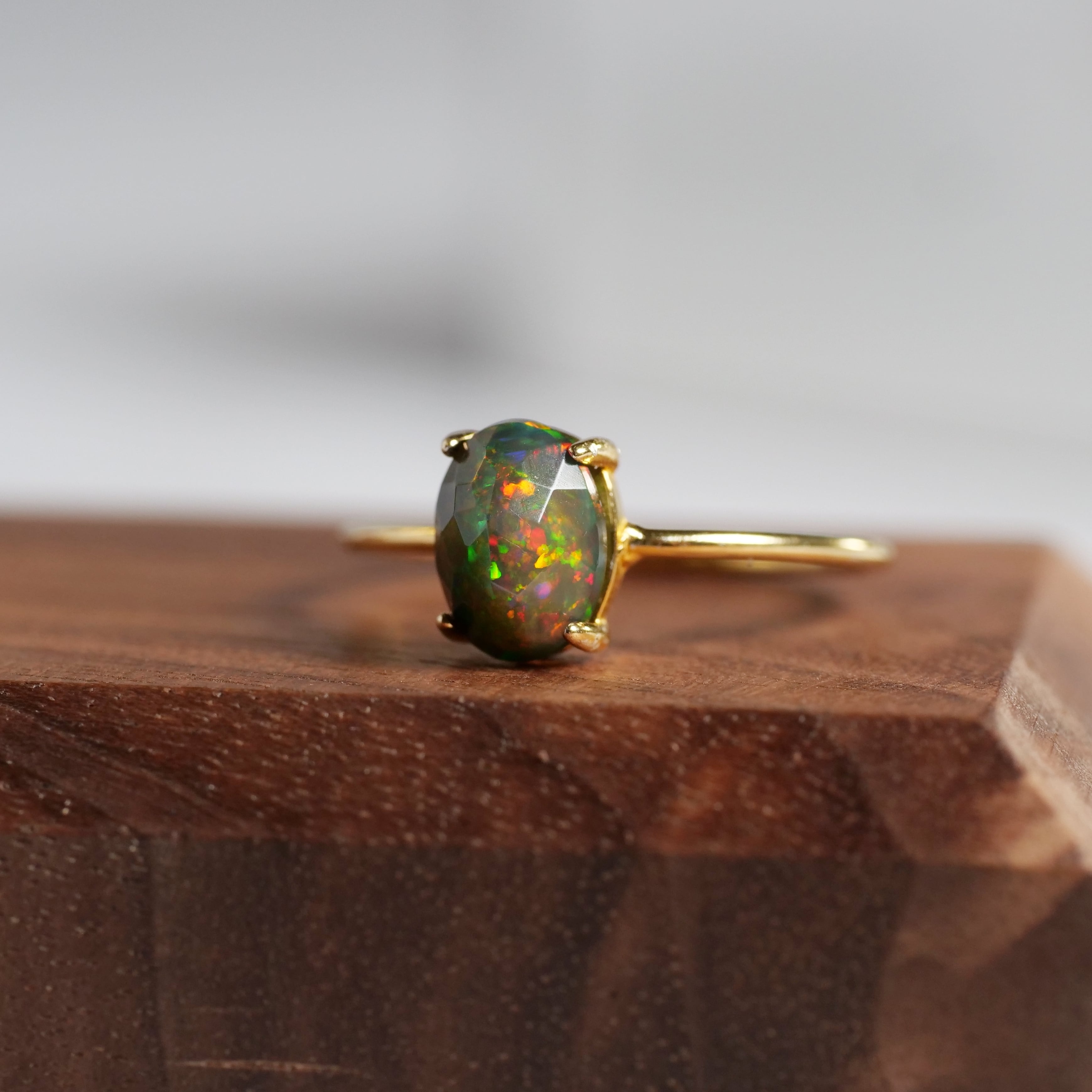 エチオピア産「ブラックオパール」のオーバル型リング。見る角度や光の入り方によって、色とりどりの表情を見せてくれます。それはまるで夜空に浮かぶオーロラのようです。