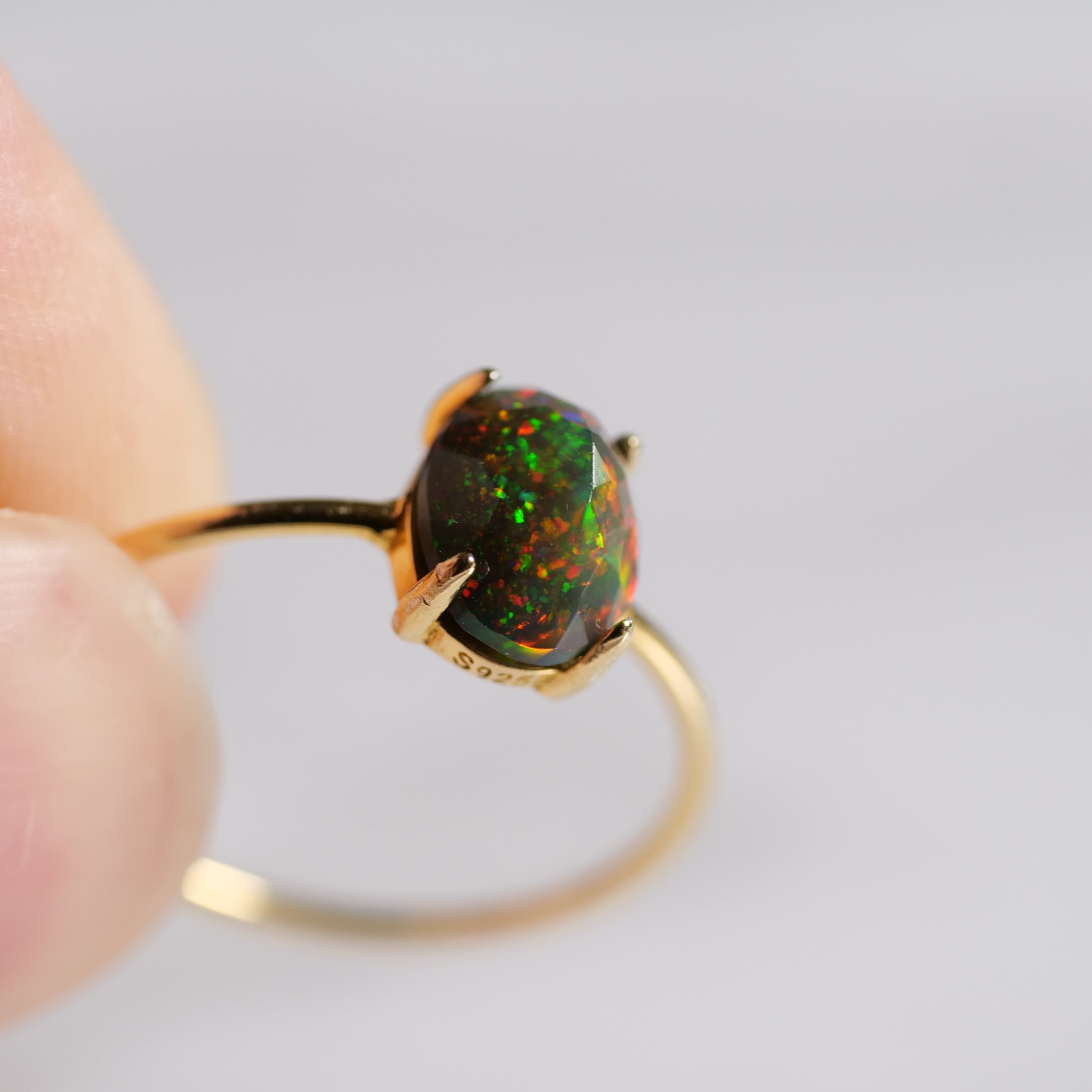 こちらの「ブラックオパール」は、もともとファセットカット用に加工されたものでしたが、ファセットカット表面よりも、裏面のほうが切り出し面として非常に美しく、プリズムシャワーでキラッキラ!表面よりも「裏面」が驚きの美しさでしたので、あえて裏面をローズカットと捉え、カボションタイプのリングに仕上げております。あえて「裏面を表面」に仕上げている、いわば「訳ありリング」です。ご理解、ご了承いただける方のみ、ご検討ください。