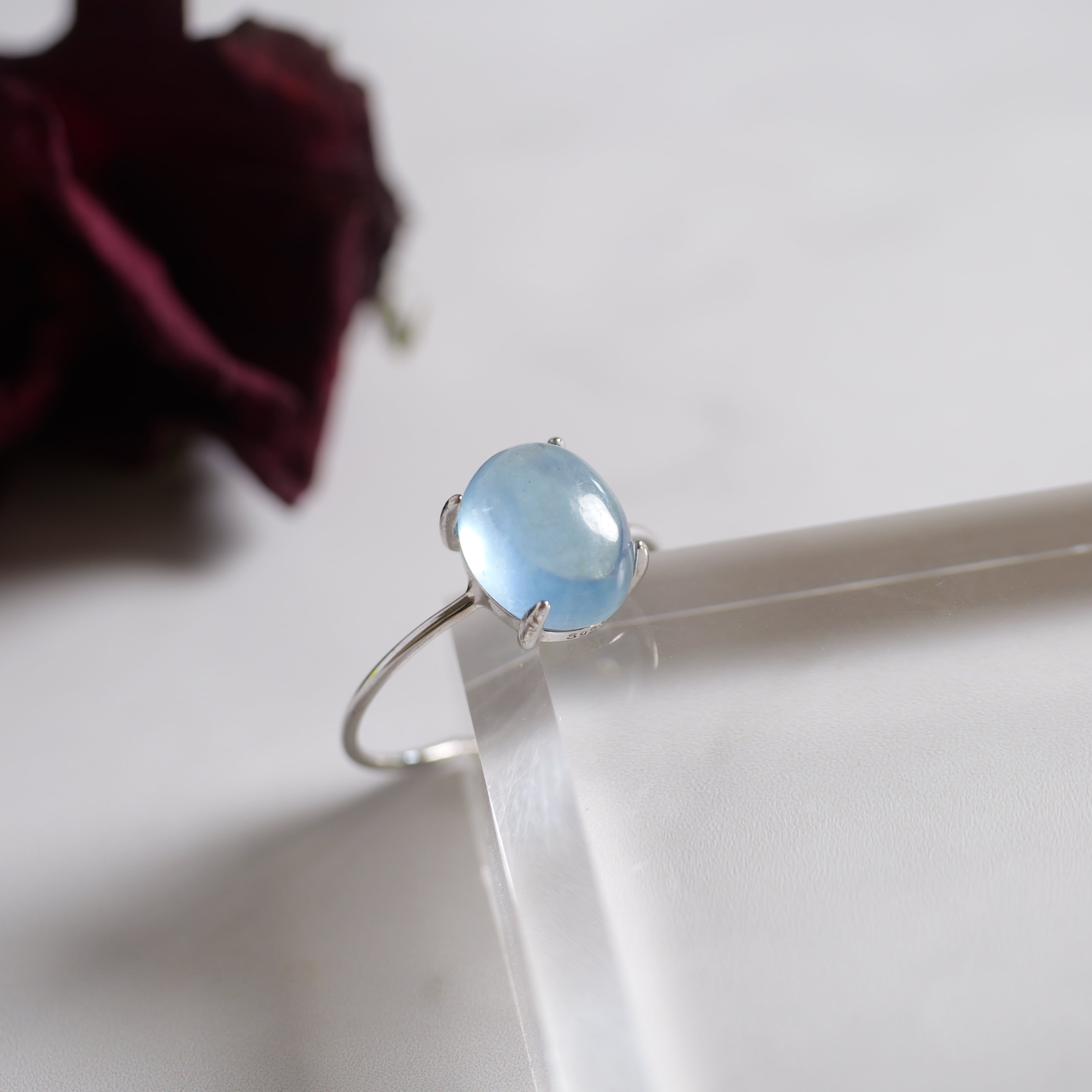 きゅるんとした表情で、とても可愛らしい「アクアマリン」のリング。まるでオアシスのような生命の泉。心をスーッと透き通らせて、潤いで満たしてくれるような透明度。水辺でのんびりしたり、乾いた喉と体を天然水で癒すがごとく、「透き通ったの天然水」をイメージし、アクアマリンだけが持つ、水属性の純粋性と繊細さが損なわれないように、シルバーロジウムのカボションリングに仕立てました。「アクアマリン」繋がることで、ほっとひと息ついてくださいね!