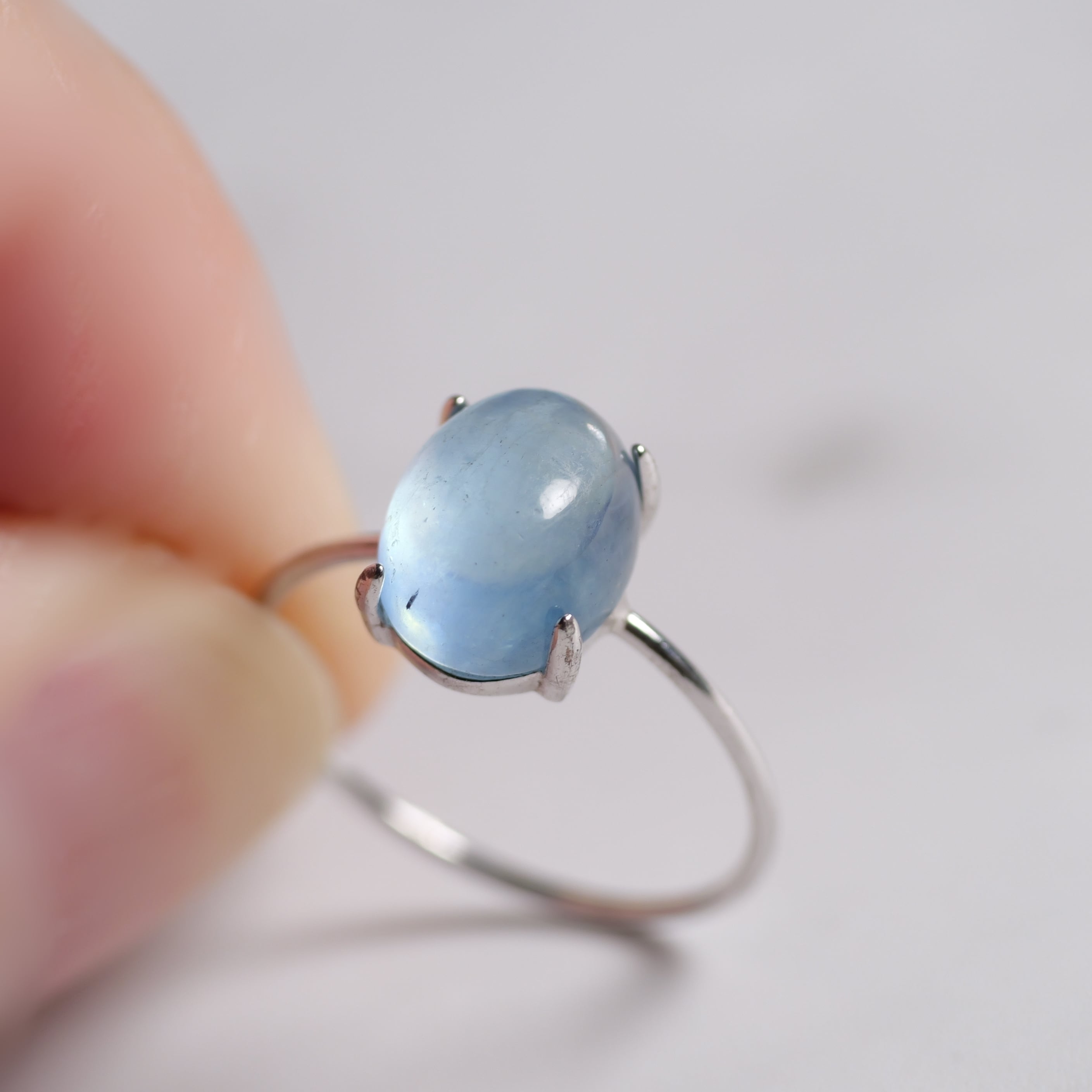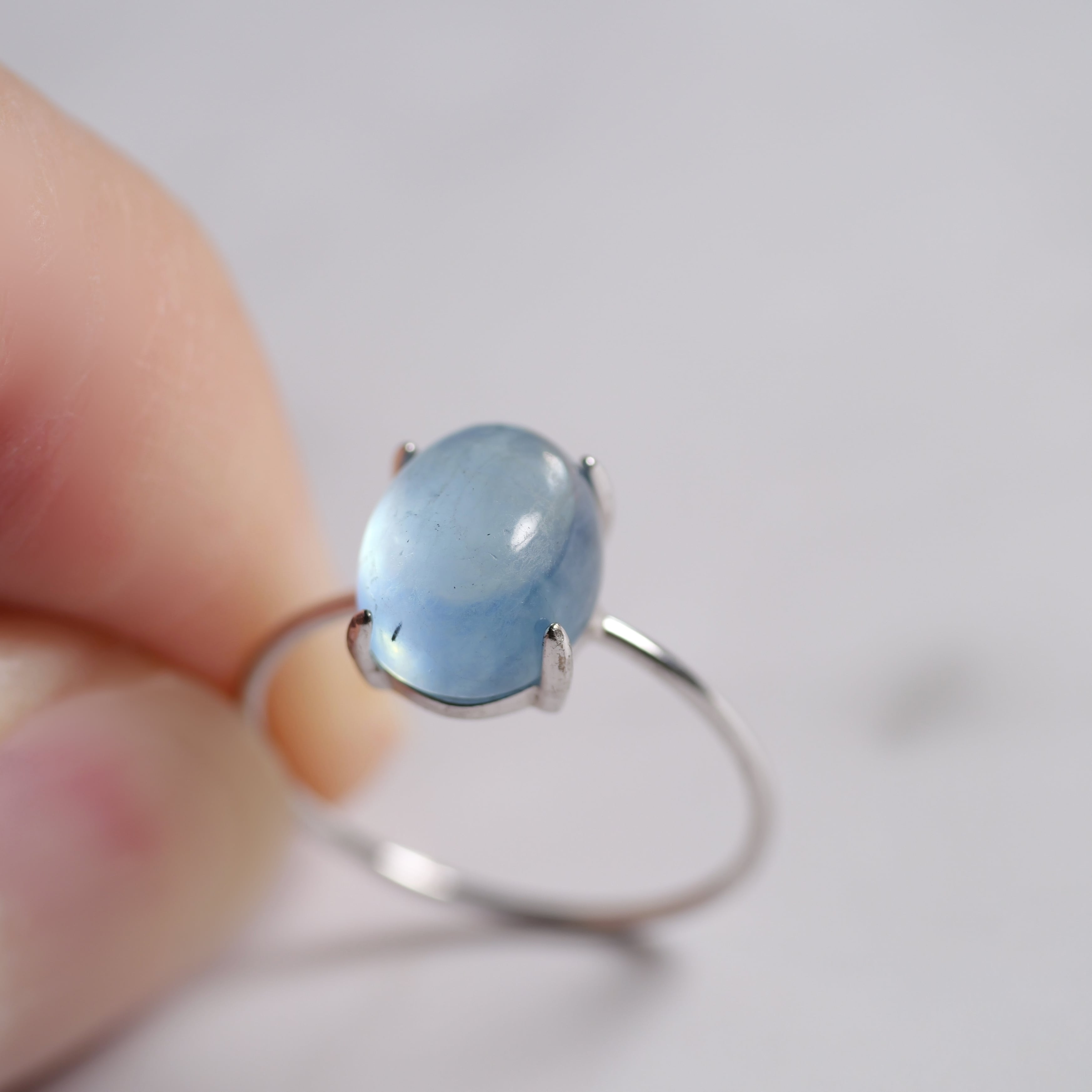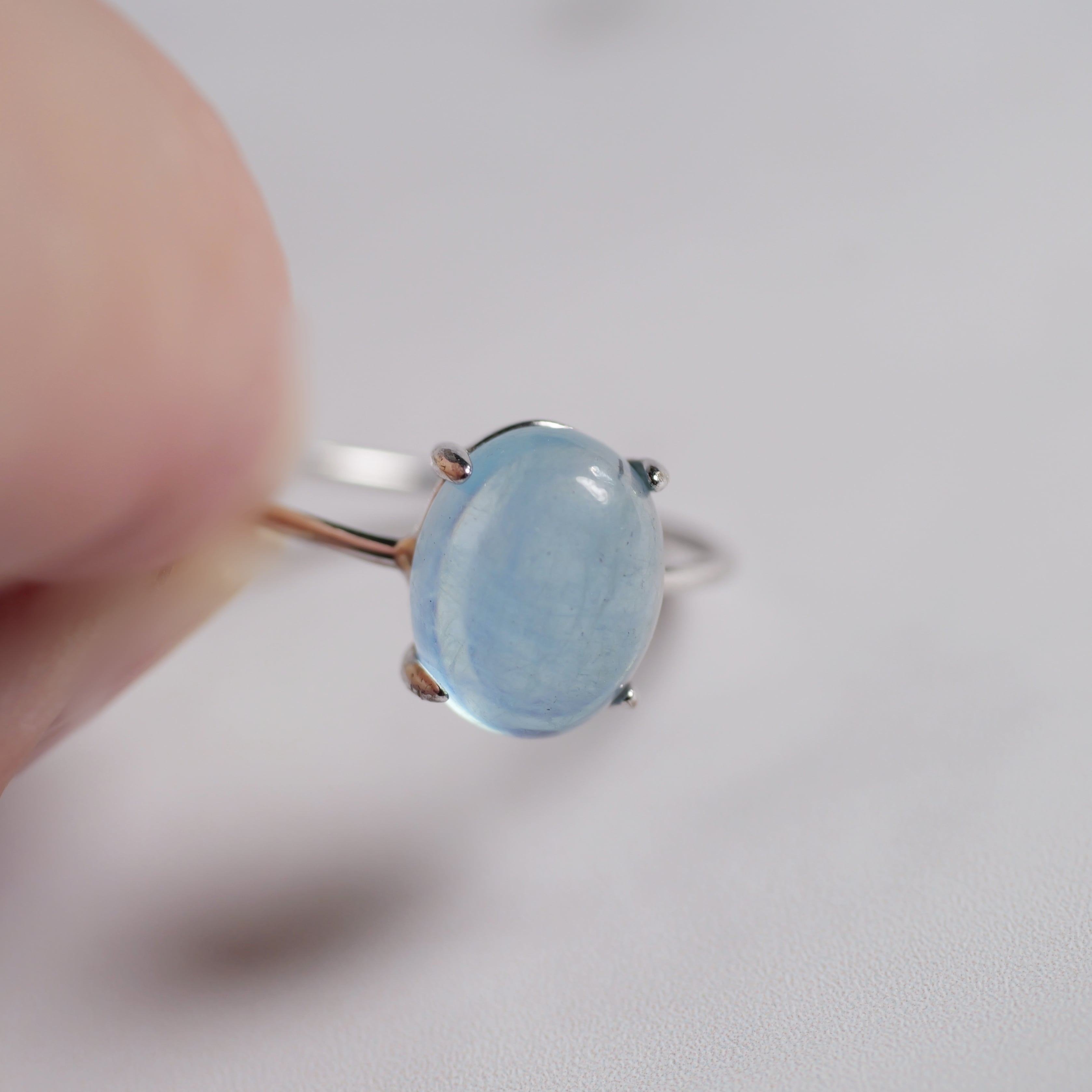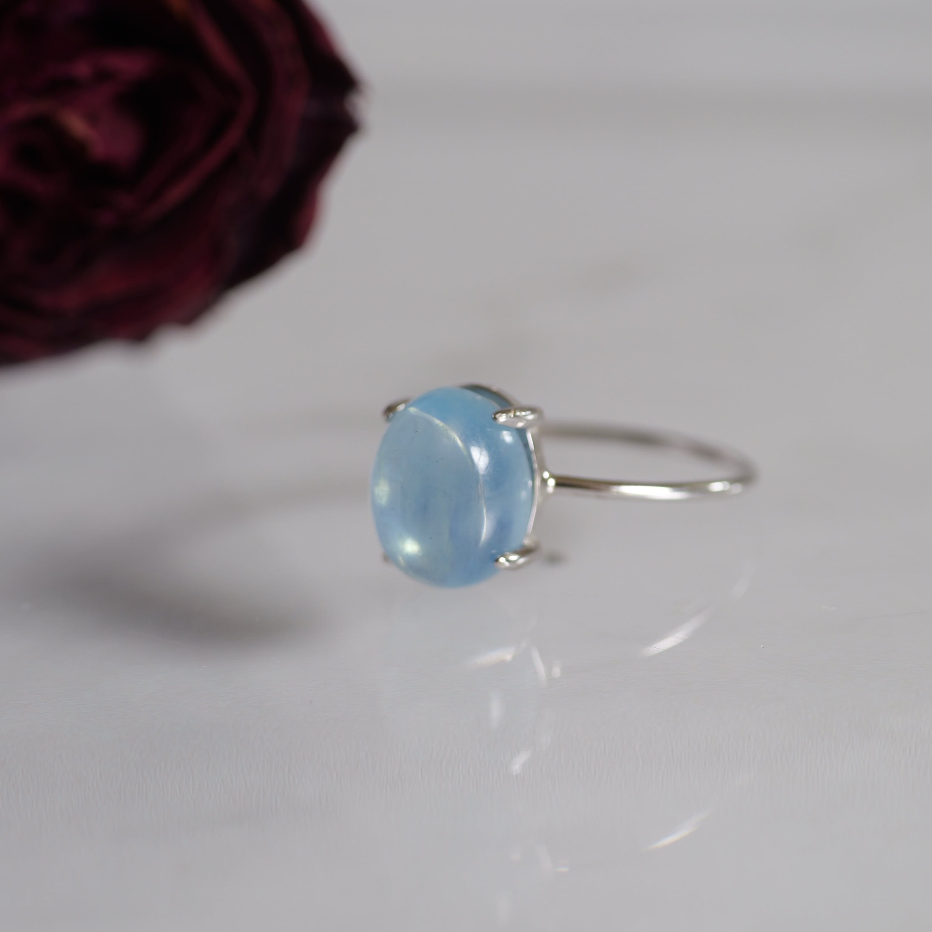 こちらの「アクアマリン オーバル リング」は、ザンビア産のカボションタイプです。ぷっくりとした立体感と照り感が素敵。きゅるんとした可愛らしいフォルムと、清らかで瑞々しい表情を持つ「アクアマリン」です。