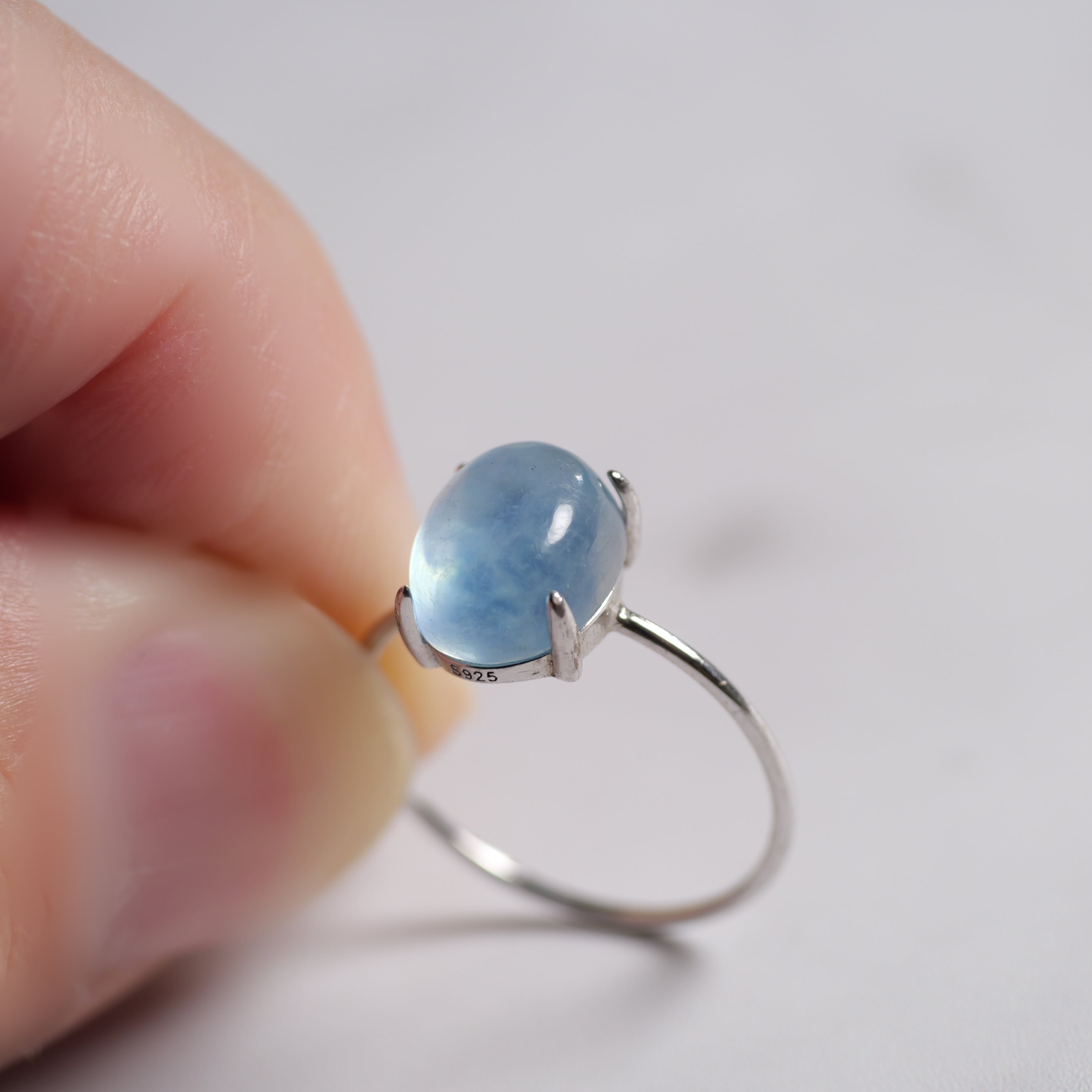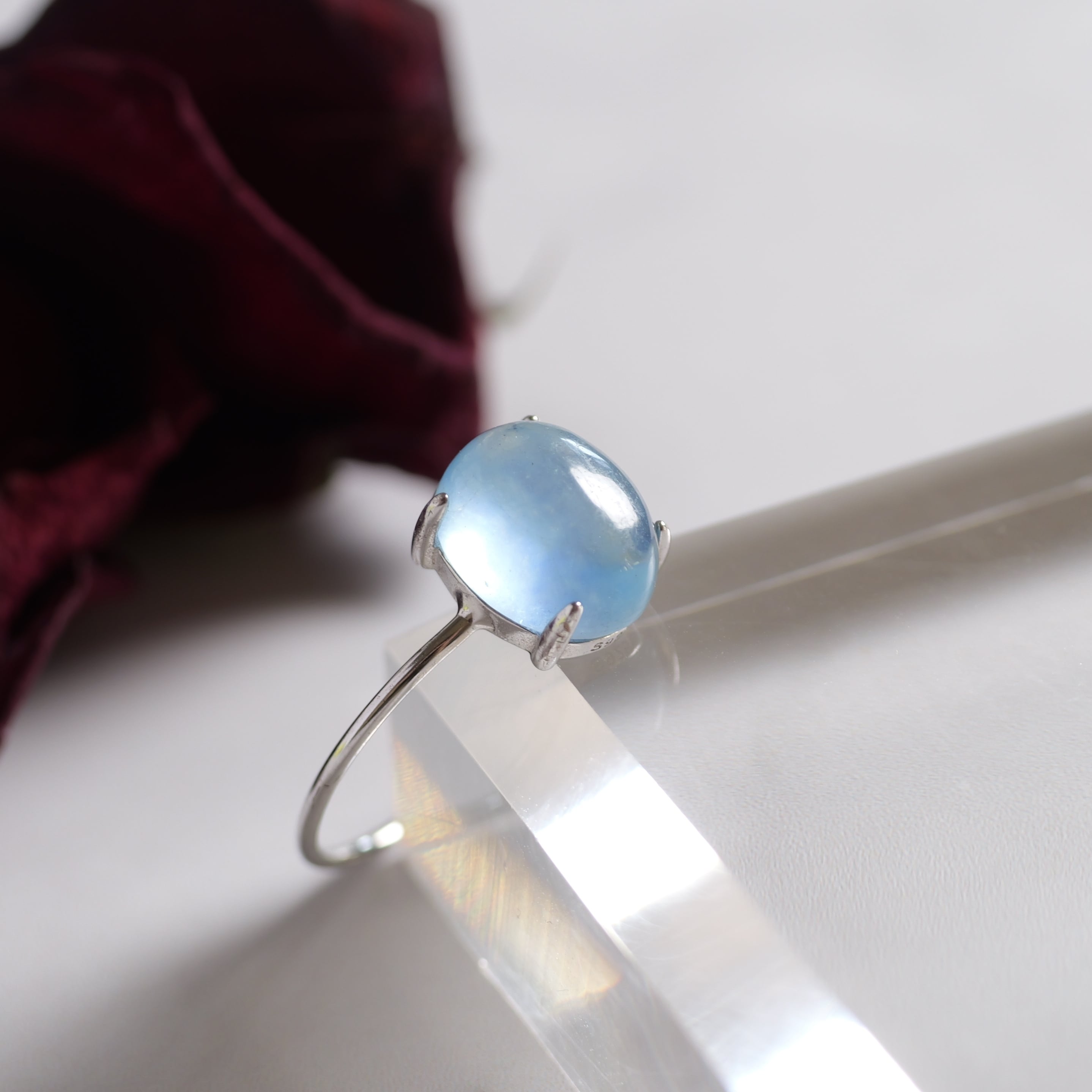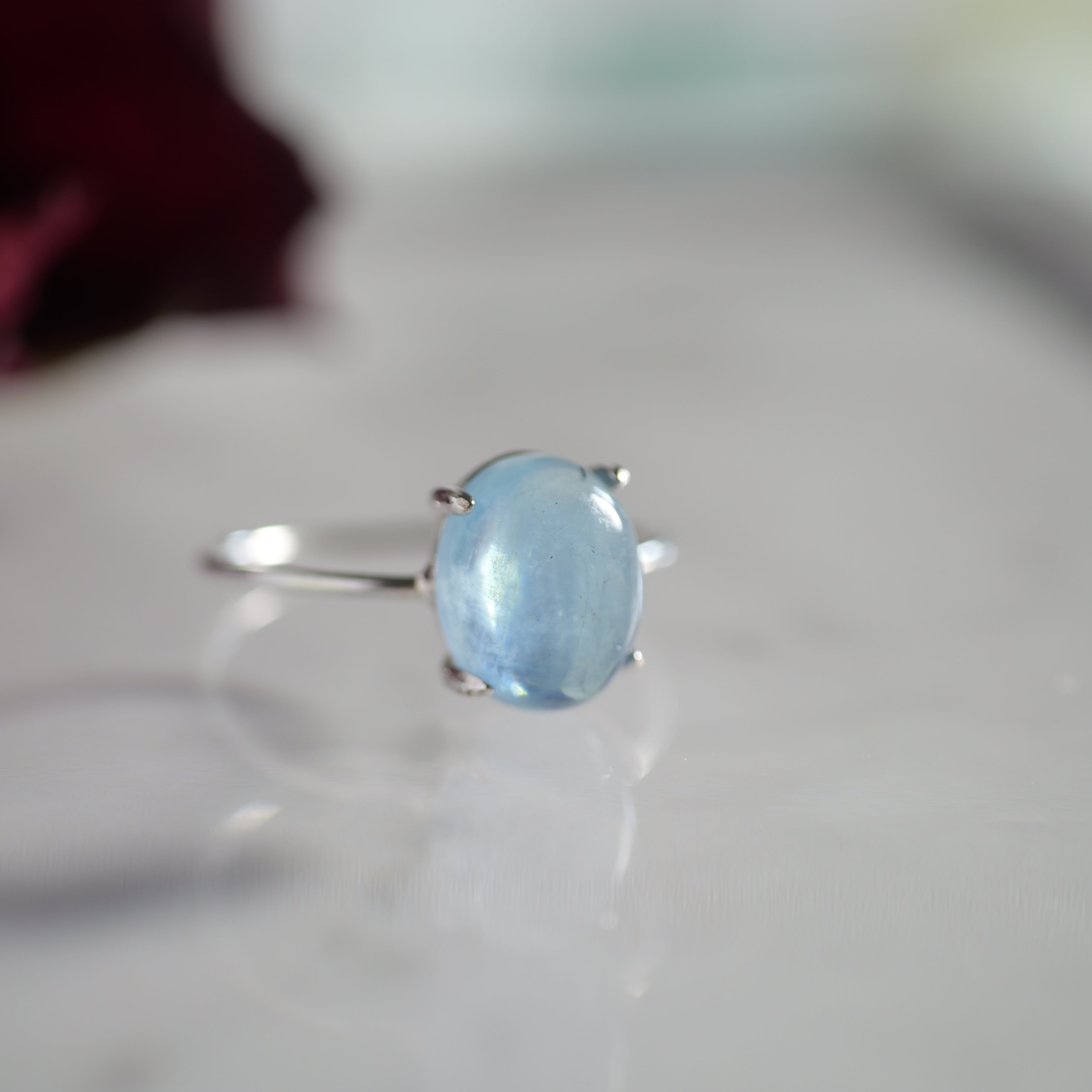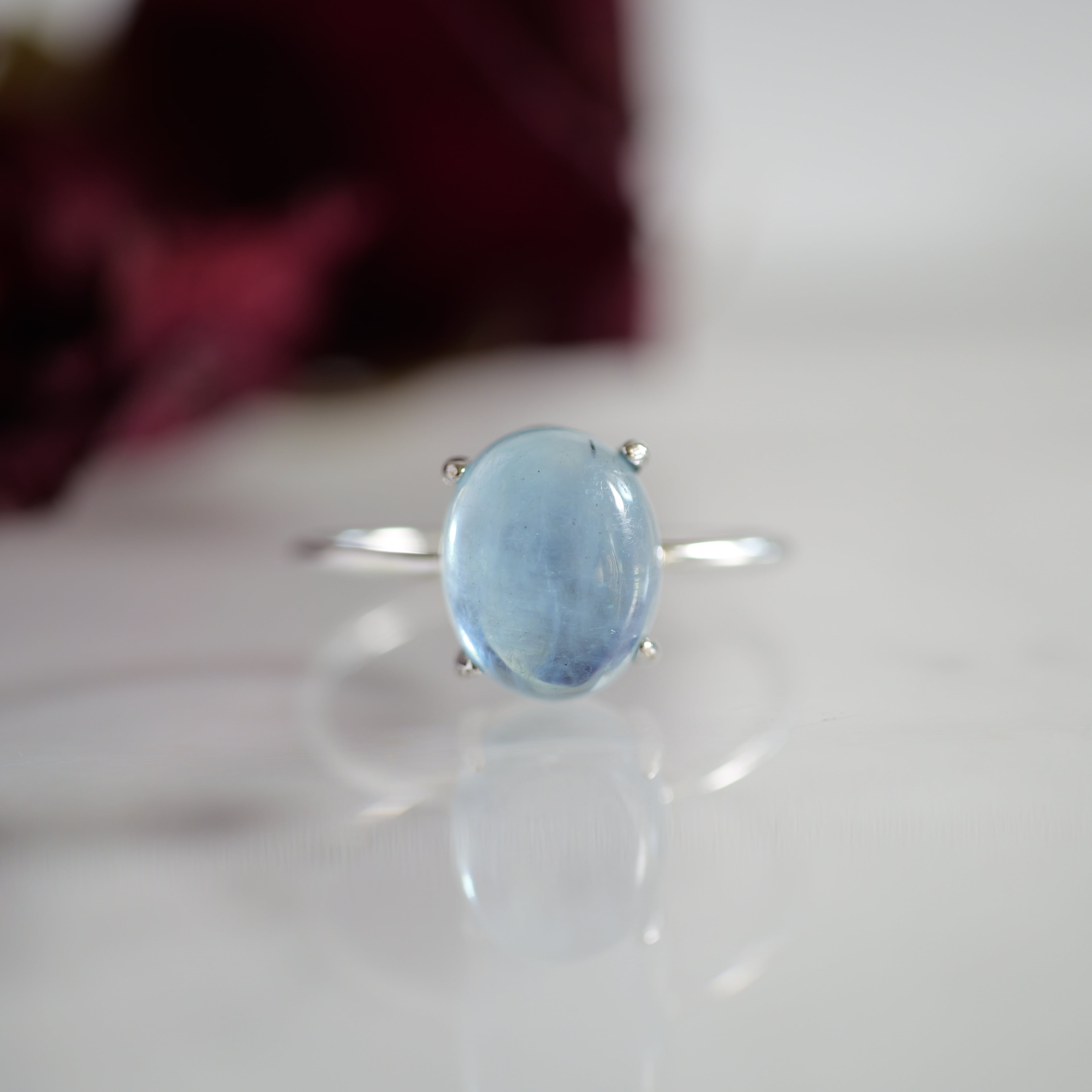 こちらの「アクアマリン オーバル リング」は、ザンビア産のカボションタイプです。ぷっくりとした立体感と照り感が素敵。きゅるんとした可愛らしいフォルムと、清らかで瑞々しい表情を持つ「アクアマリン」です。