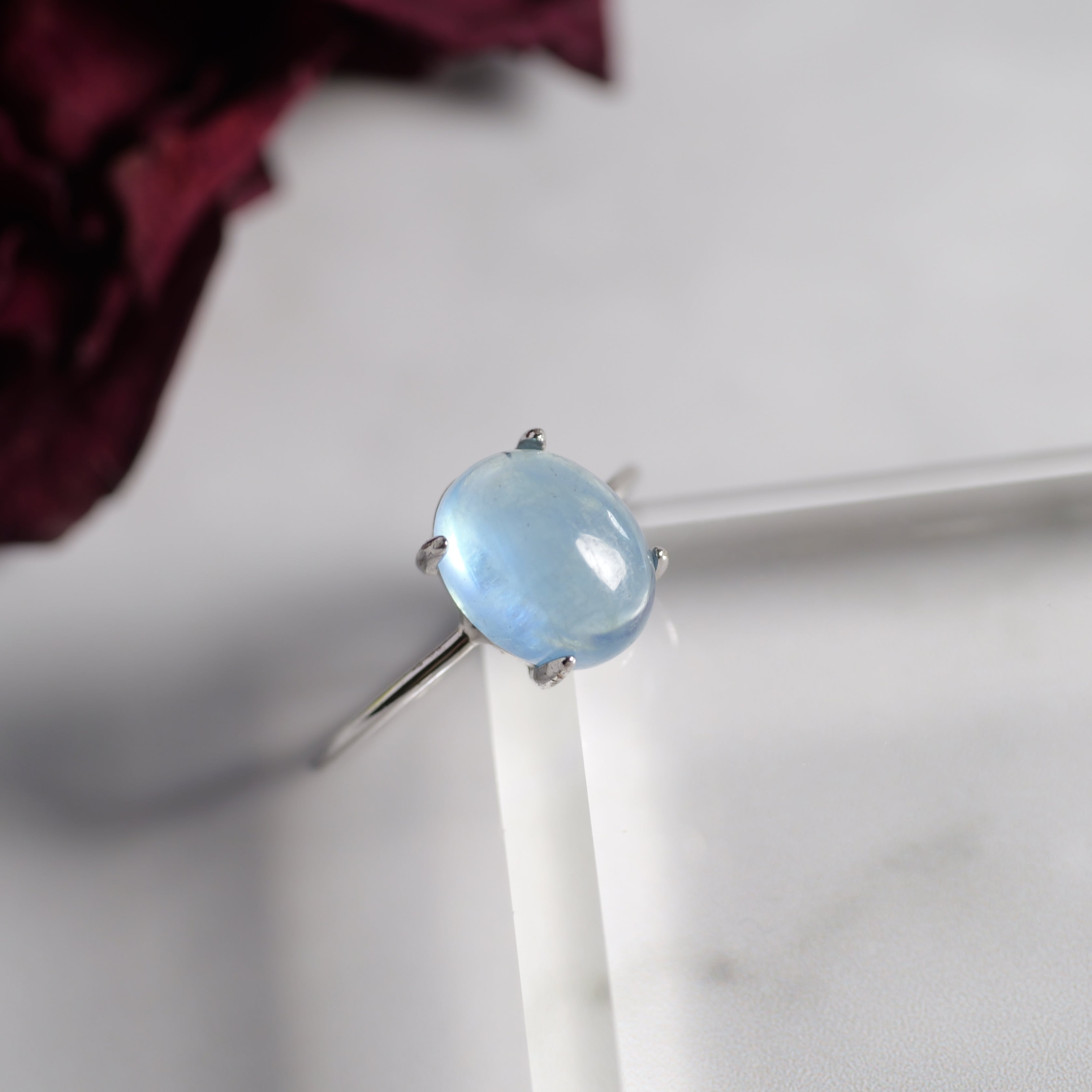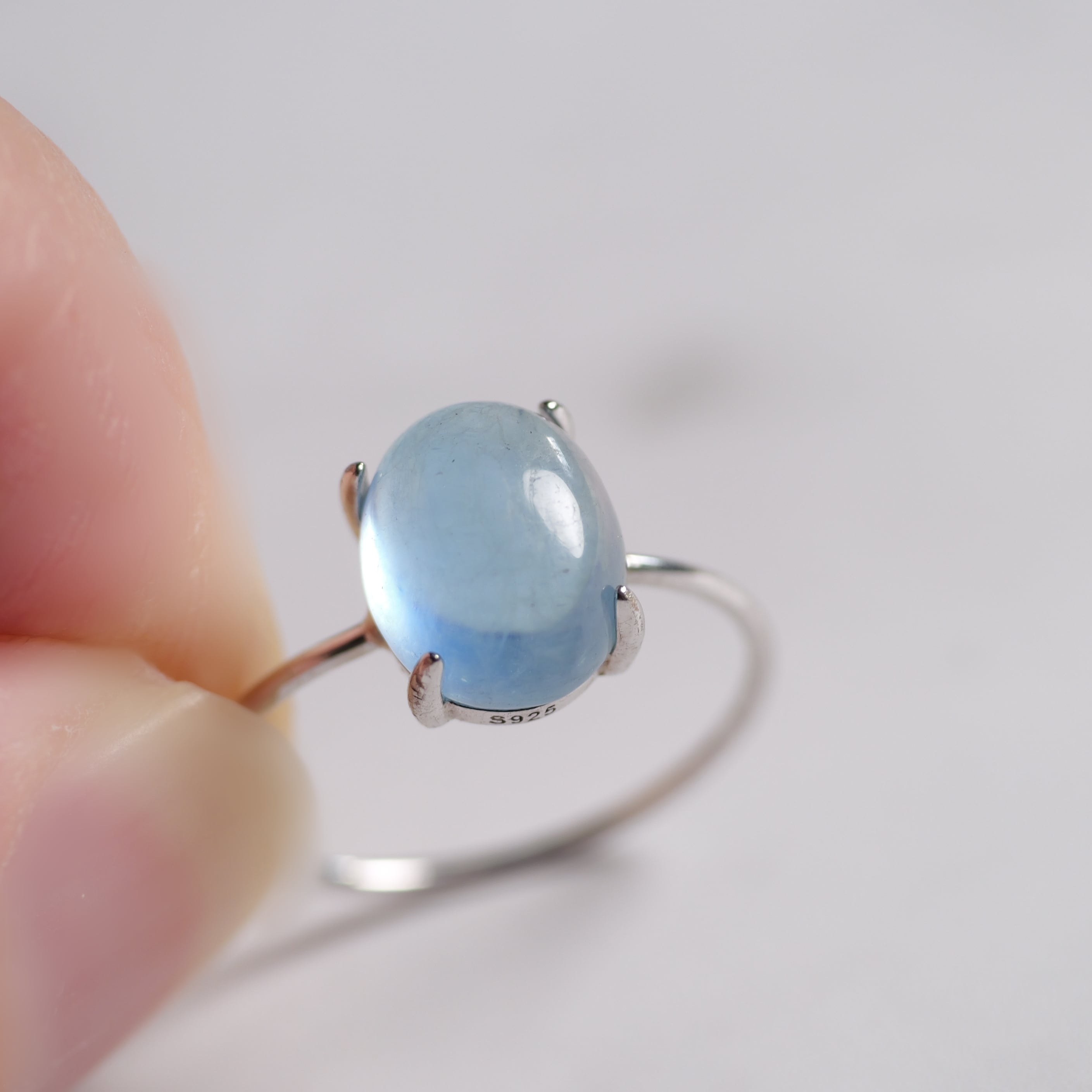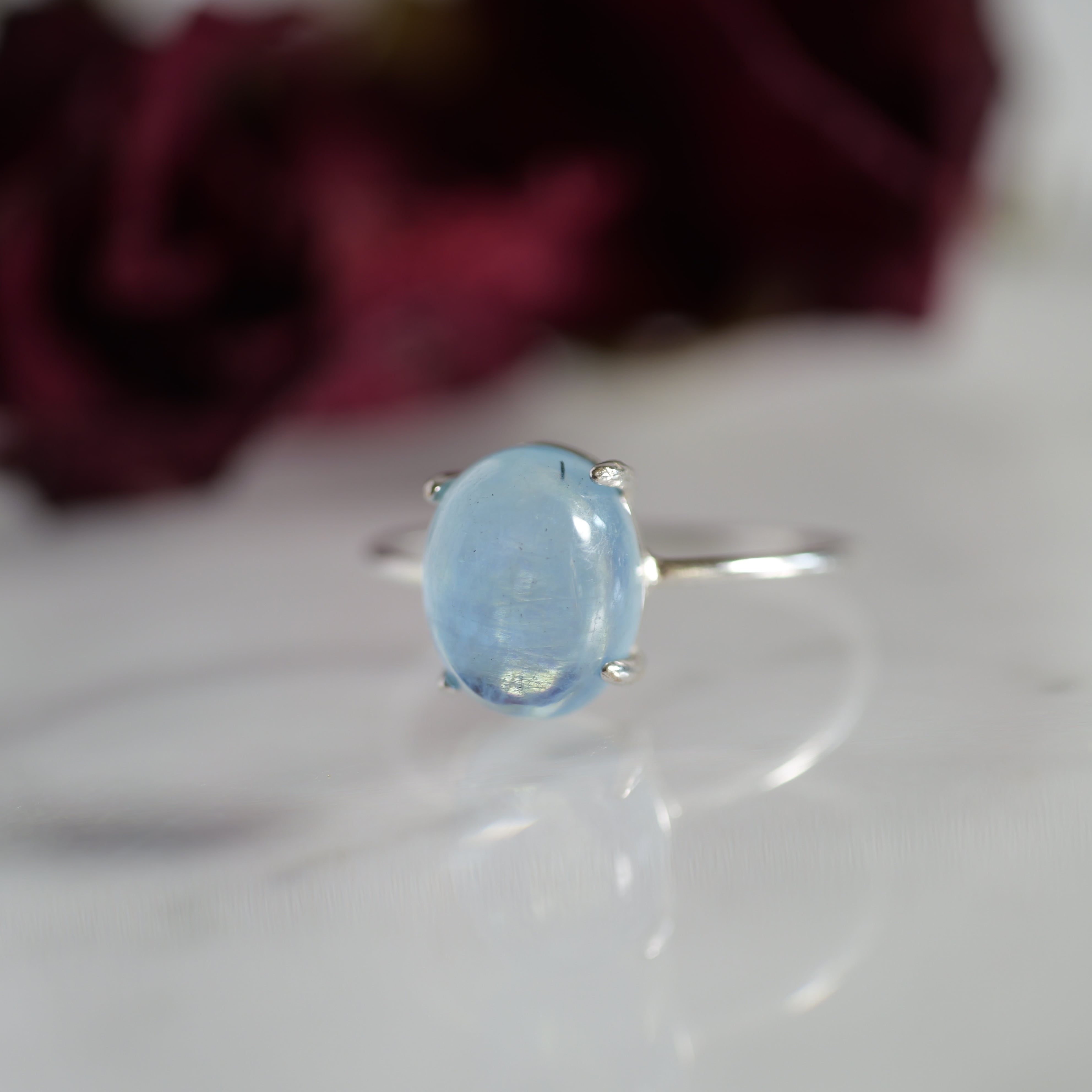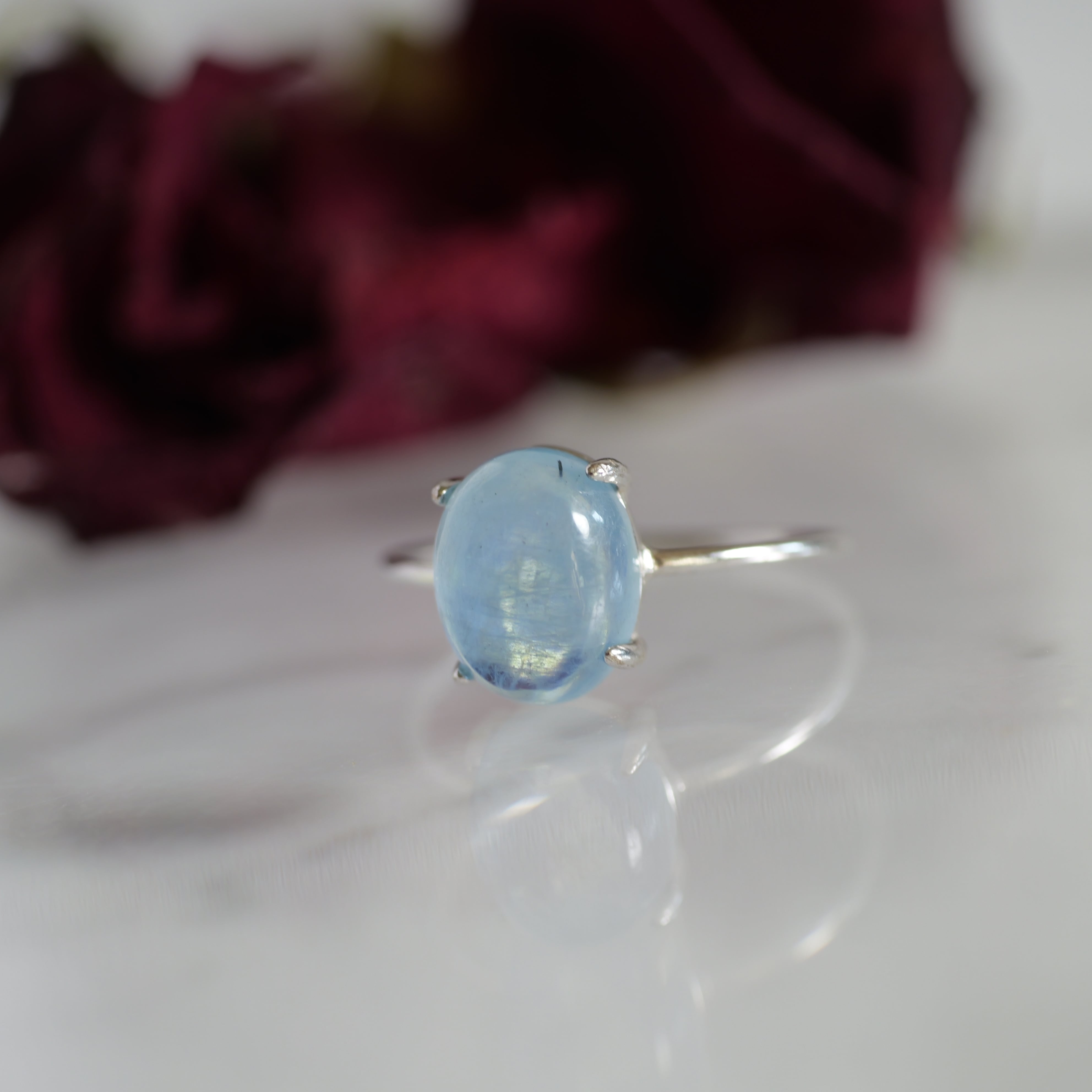 こちらの「アクアマリン オーバル リング」は、ザンビア産のカボションタイプです。ぷっくりとした立体感と照り感が素敵。きゅるんとした可愛らしいフォルムと、清らかで瑞々しい表情を持つ「アクアマリン」です。