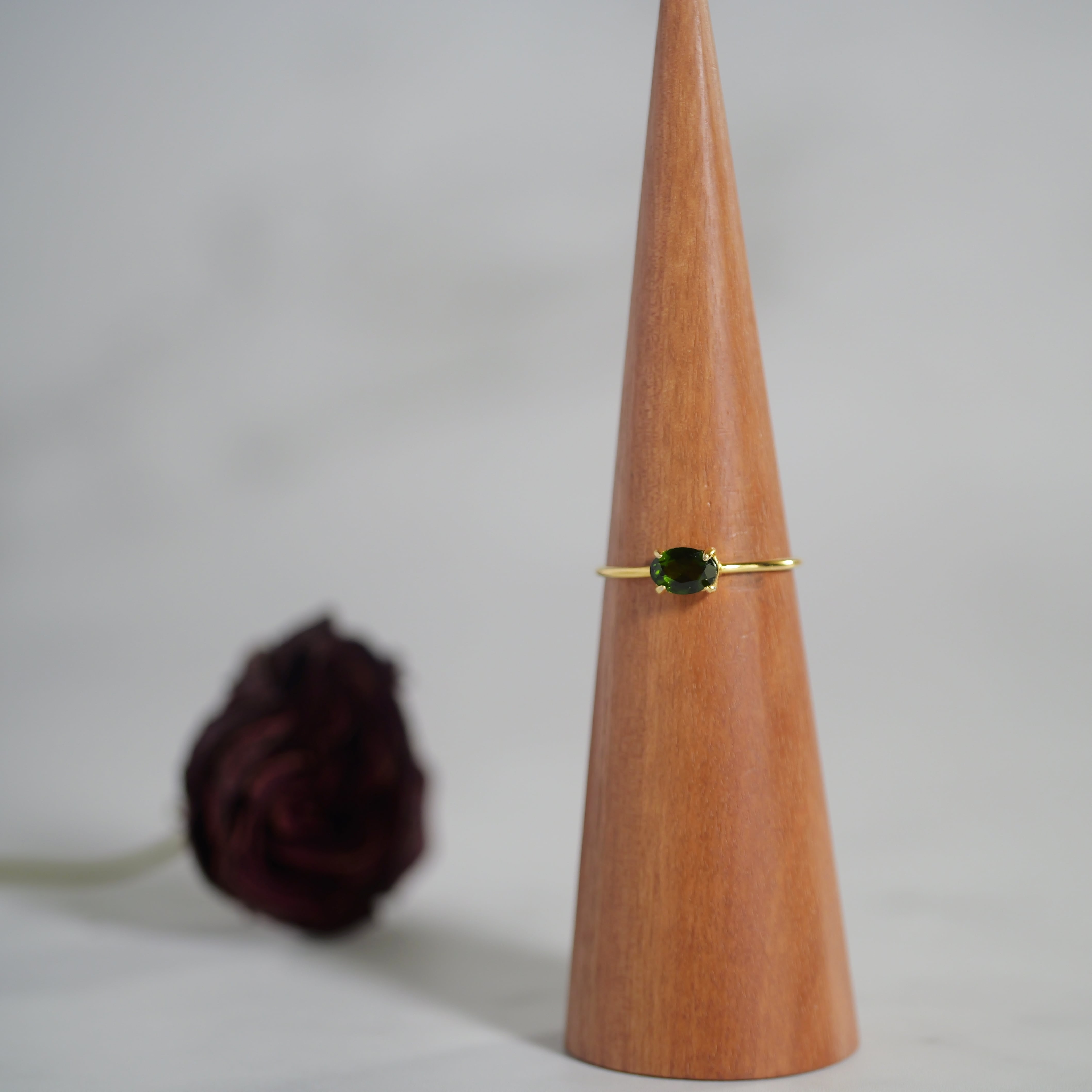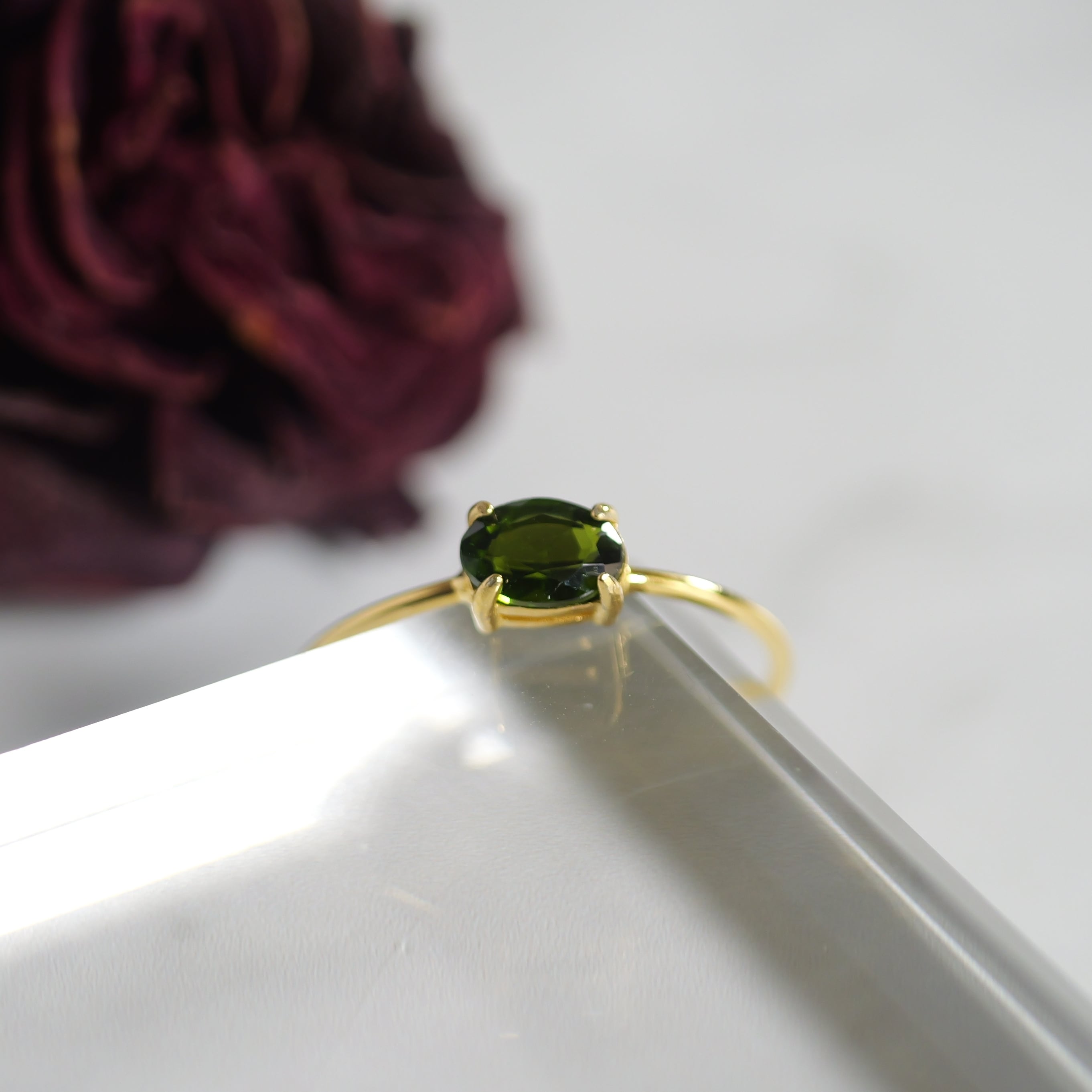「クロムダイオプサイド」の深い緑色は、わずかに渋みを含んでおり、独特の陰影を生み出します。その深みが、気品や奥ゆかしさを感じさせ、大人のさりげないお洒落に寄り添います。上品な深緑の光を放つ「クロムダイオプサイド」を普段使いにぴったりの6×4mmサイズのリングに仕立てました。