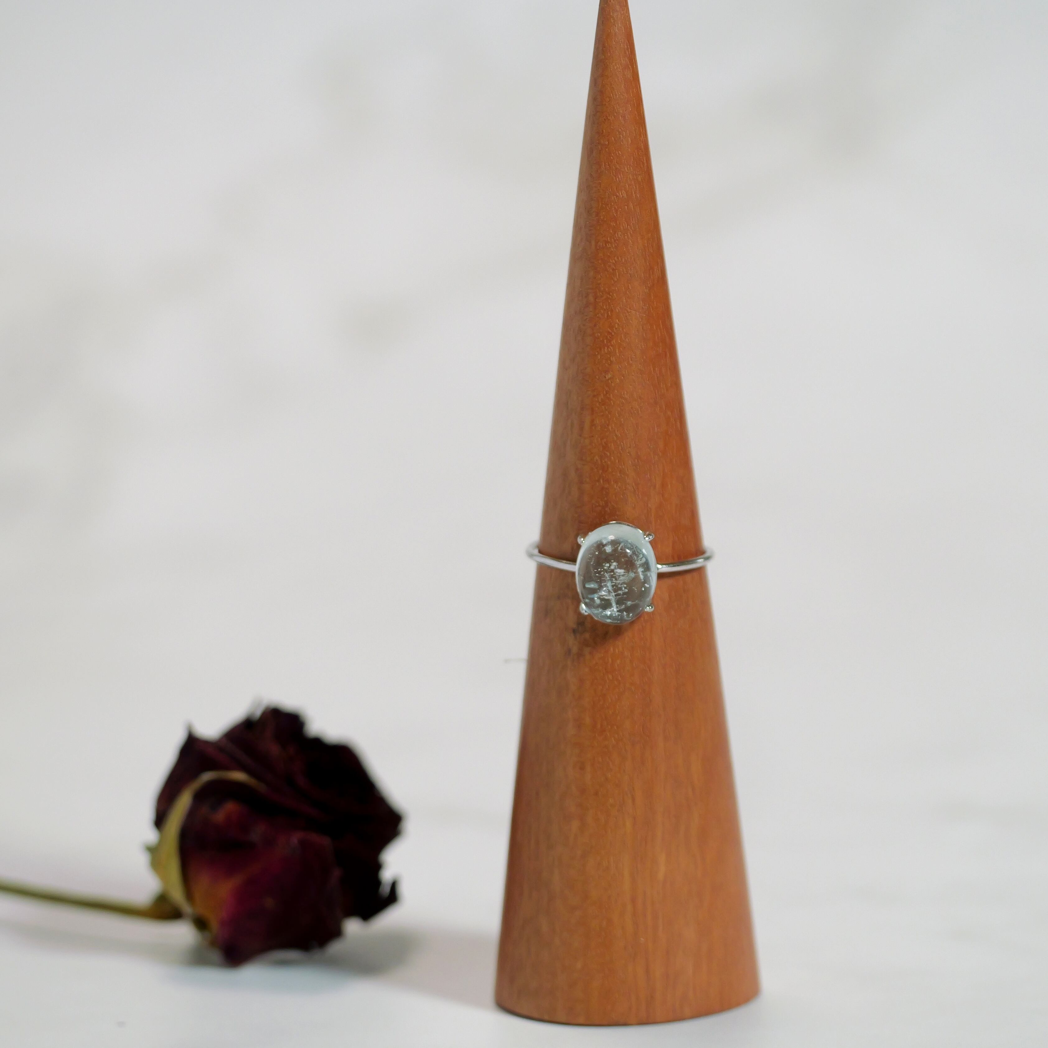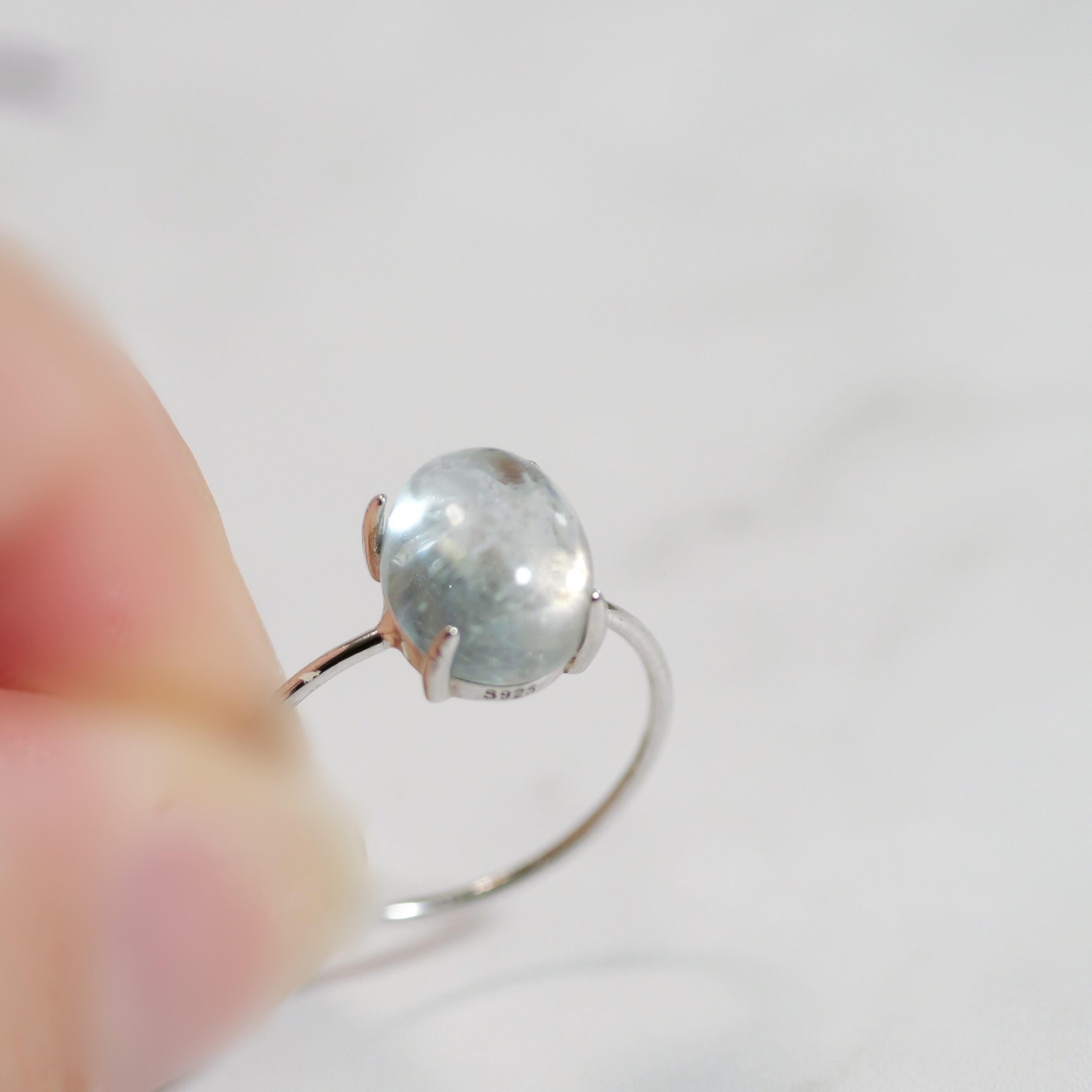 きゅるんとした表情で、とても可愛らしい「アクアマリン」のリング。まるでオアシスのような生命の泉。心をスーッと透き通らせて、潤いで満たしてくれるような透明度。水辺でのんびりしたり、乾いた喉と体を天然水で癒すがごとく、「透き通ったの天然水」をイメージし、アクアマリンだけが持つ、水属性の純粋性と繊細さが損なわれないように、シルバーロジウムのカボションリングに仕立てました。「アクアマリン」繋がることで、ほっとひと息ついてくださいね!