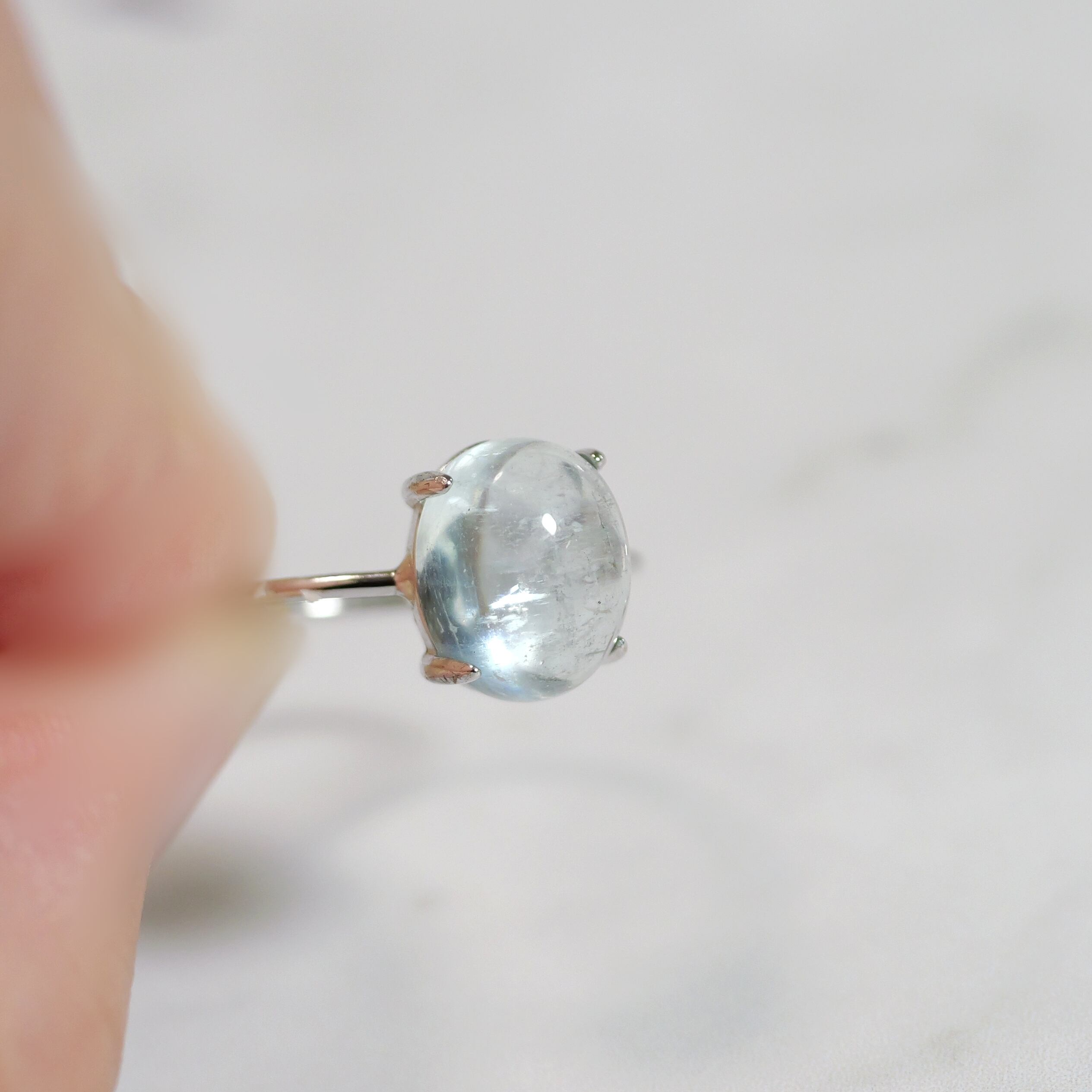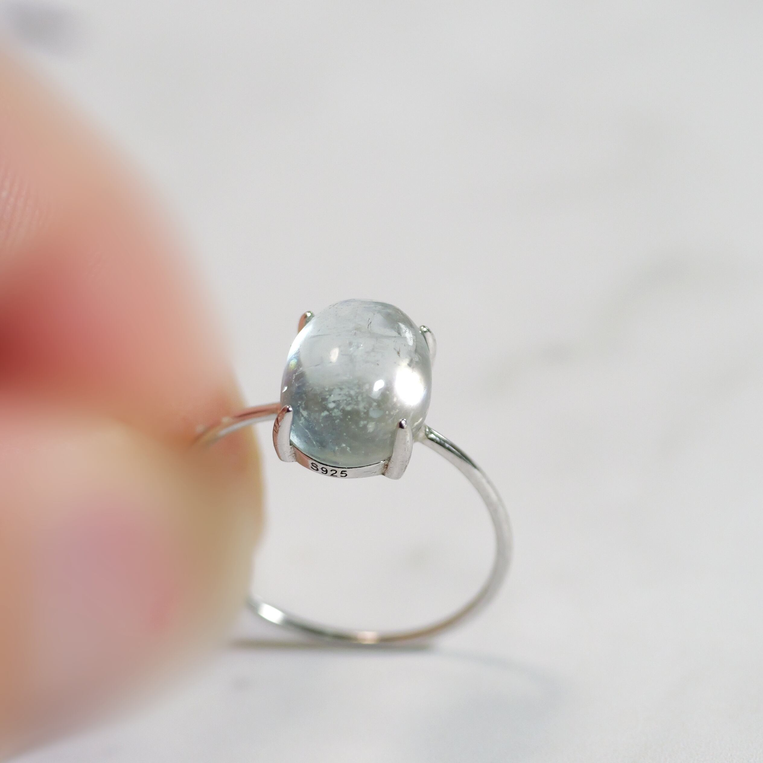 こちらの「アクアマリン オーバル リング」は、ザンビア産のカボションタイプです。ぷっくりとした立体感と照り感が素敵。きゅるんとした可愛らしいフォルムと、清らかで瑞々しい表情を持つ「アクアマリン」です。