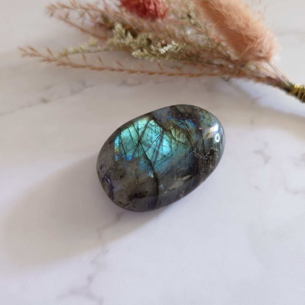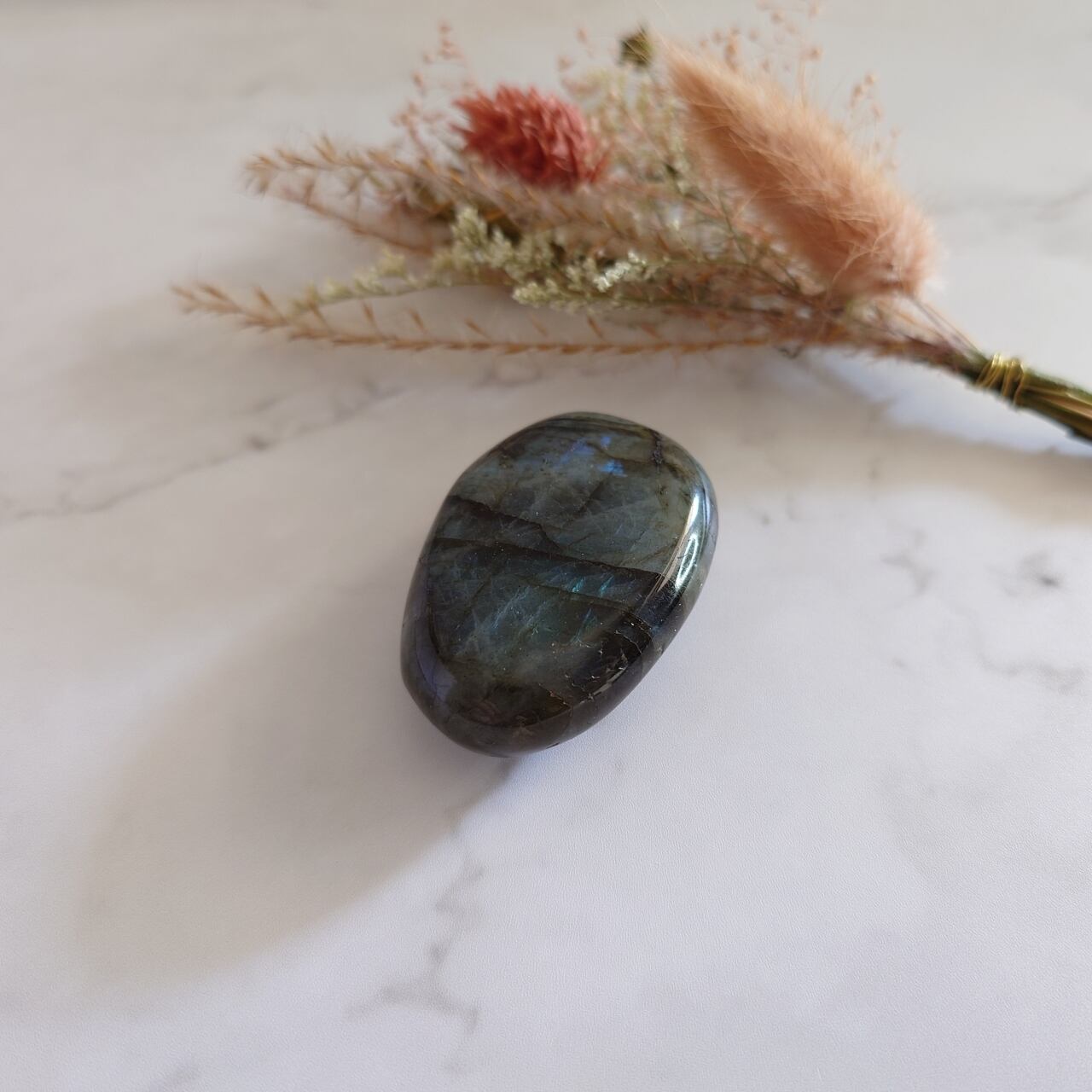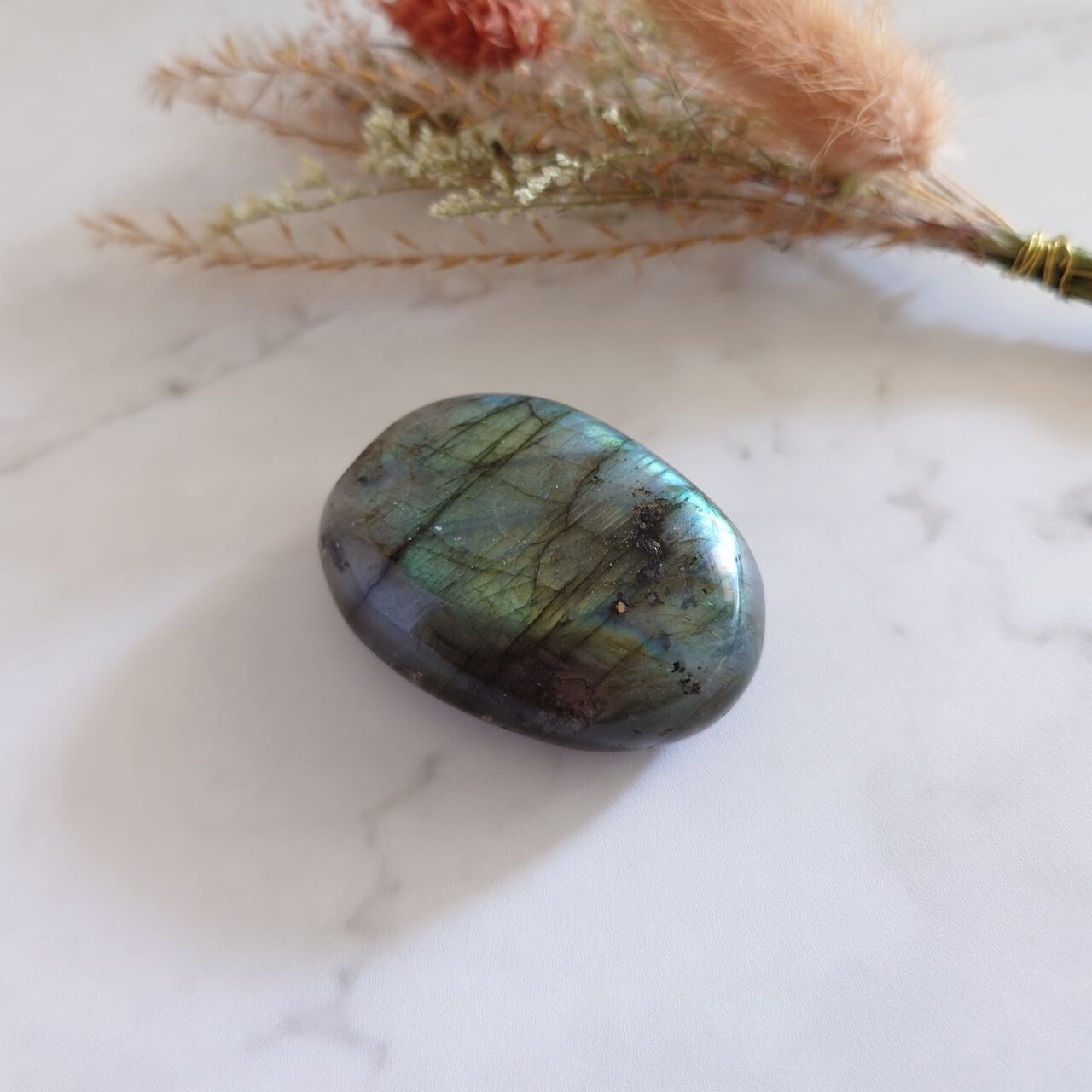 ラブラドライトの原石、大粒タンブル(磨き石)です。デスクの上に置いても、寝室や玄関に置いても素敵。オフィスのパソコン周りをラブラドライトで飾ってみてもいいかもしれませんね。ちょうど手のひらにぴったり乗るようなサイズですので、軽く握って自然のエネルギーを感じてみると、リフレッシュ効果があるかもしれません。
