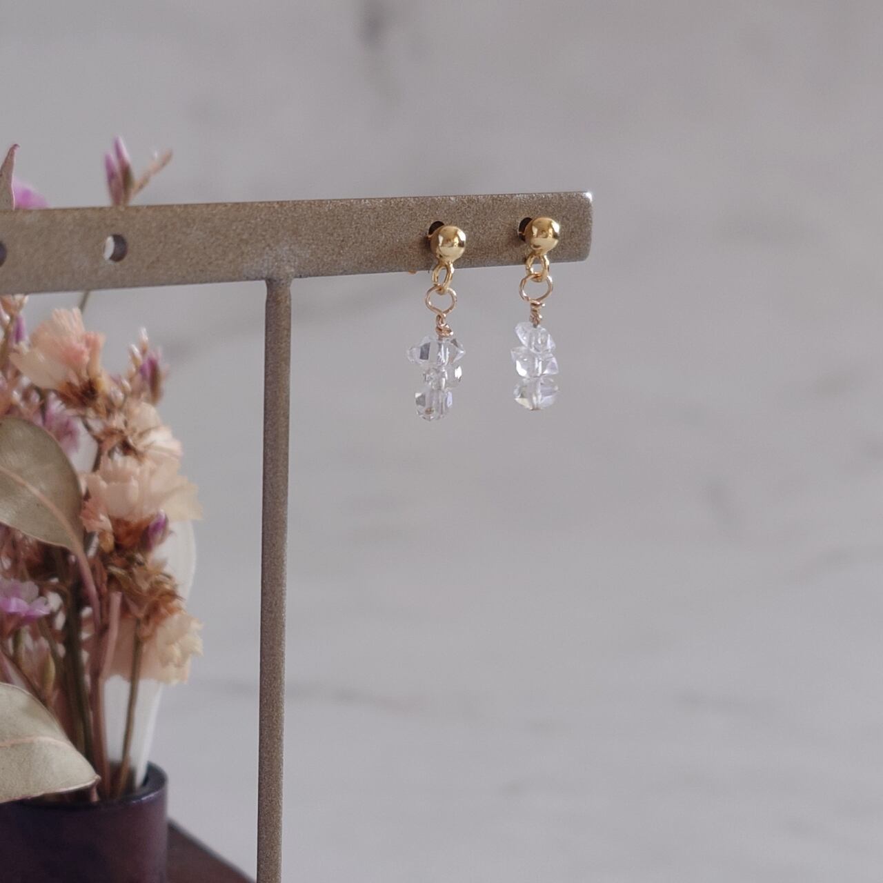 ひとつひとつのハーキマーは、約縦2mm×横5mmで、横に5つハーキマーを連ねたトレンド感のあるデザインです。ハーキマー3つ重ねた横の長さは、約7mmになります。繊細でエレガントフェミニンなピアスです。