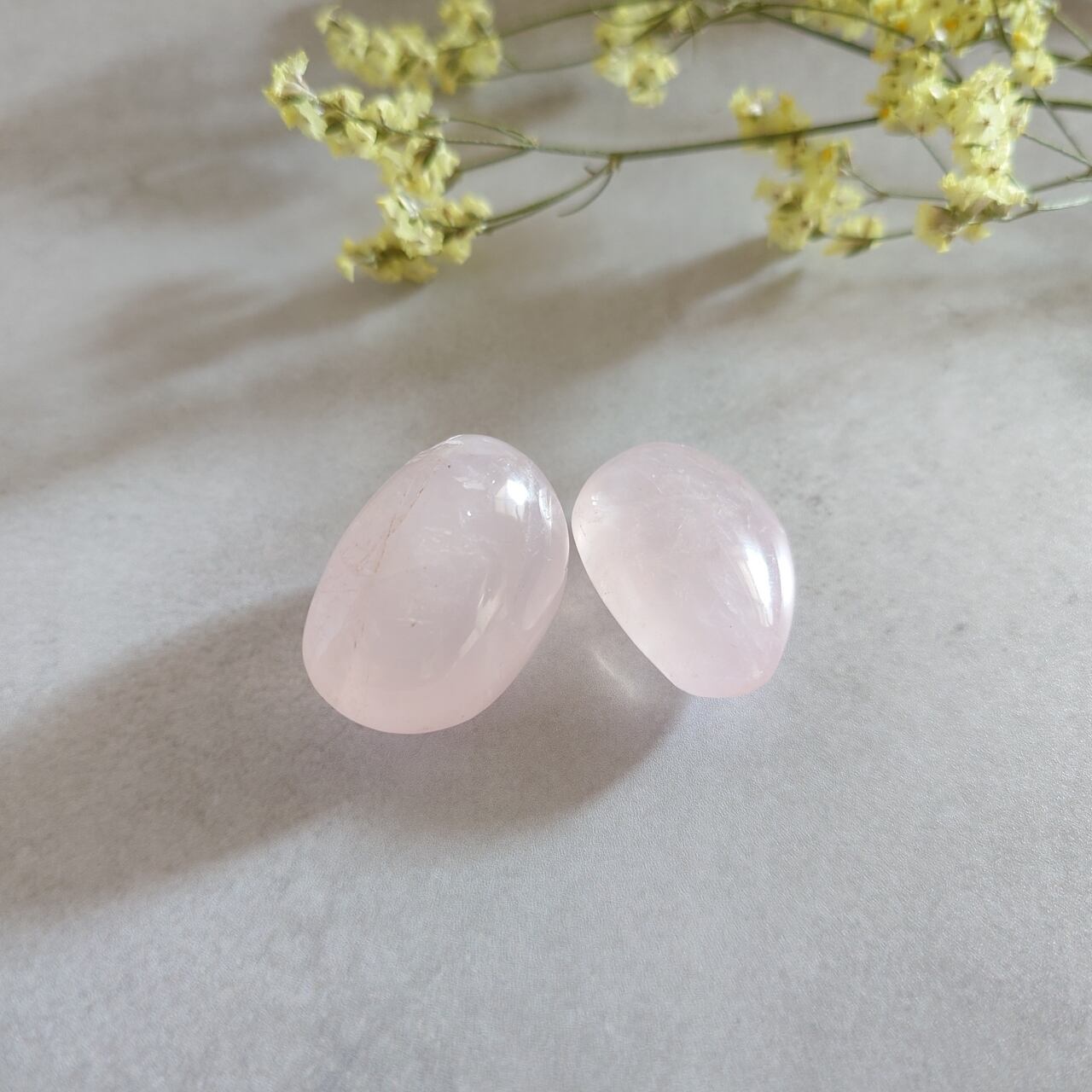 「ローズクォーツ タンブル C」は、ローズクォーツのタンブルが2個セットになった商品です。クォーツらしい明るさと光の反射が豊かな2品。動きのあるローズカラーで、流れる雲のような天然石そのものの結晶筋などを楽しんでいただけるポジティブオーラ満載のローズクォーツです。