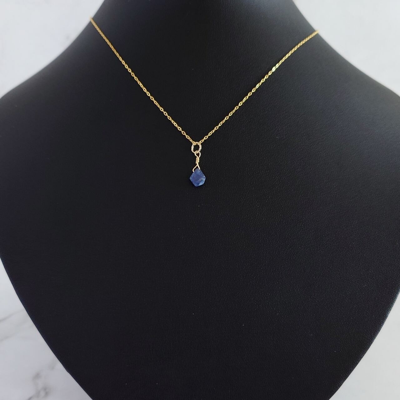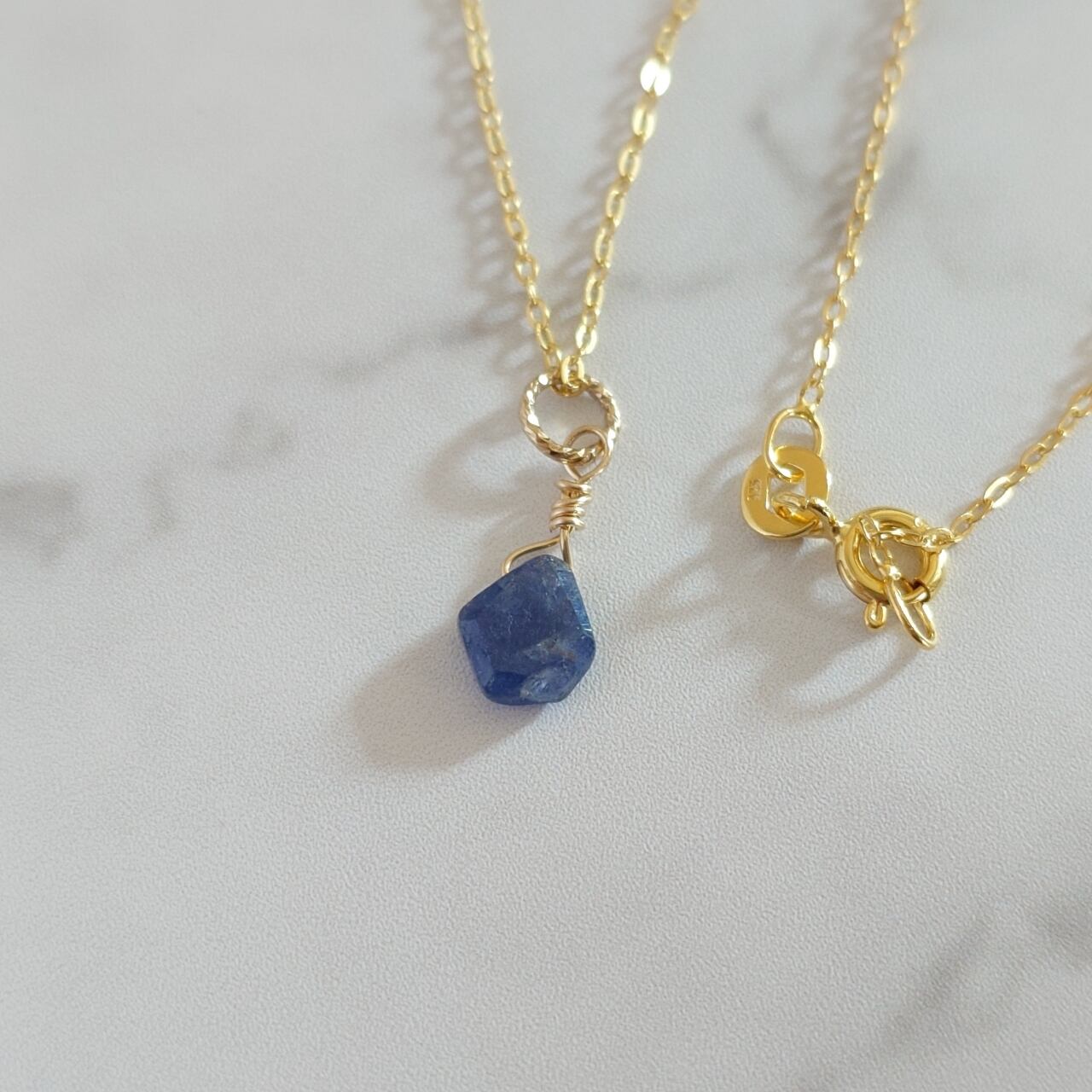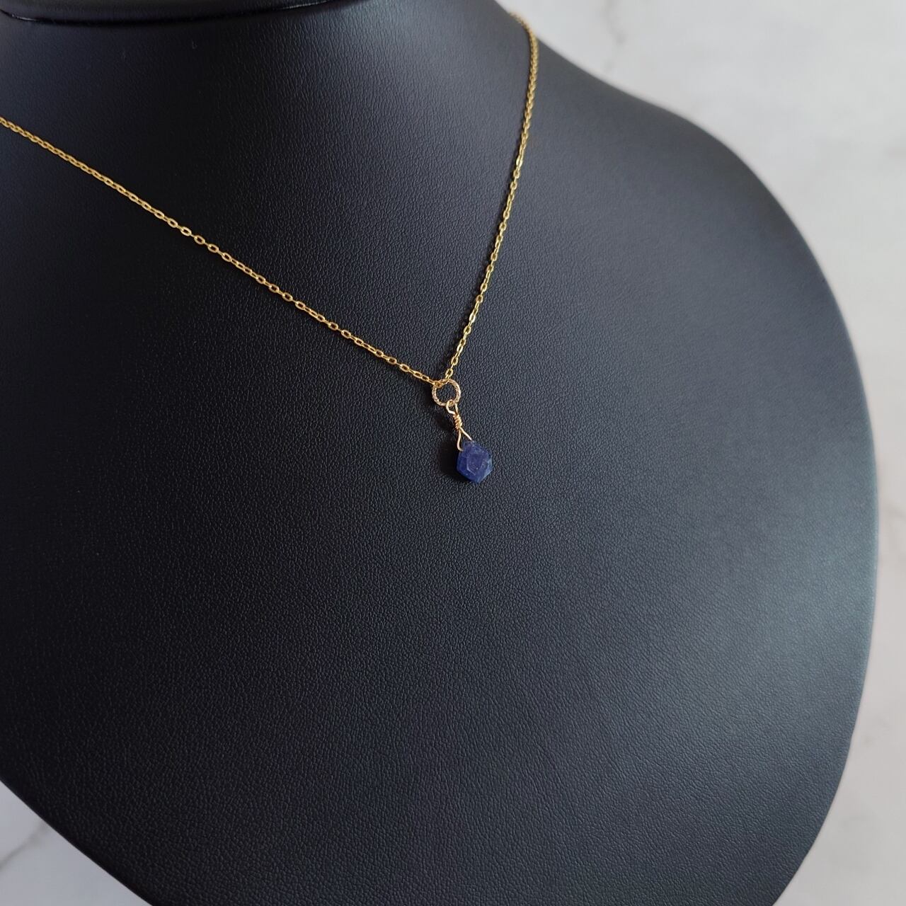 「非加熱ブルーサファイア ネックレス No.2」は、スライスカットされたブルーサファイアで、シックで大人っぽい色とマットな質感に、可愛らしい六角形の形状を特徴としています。