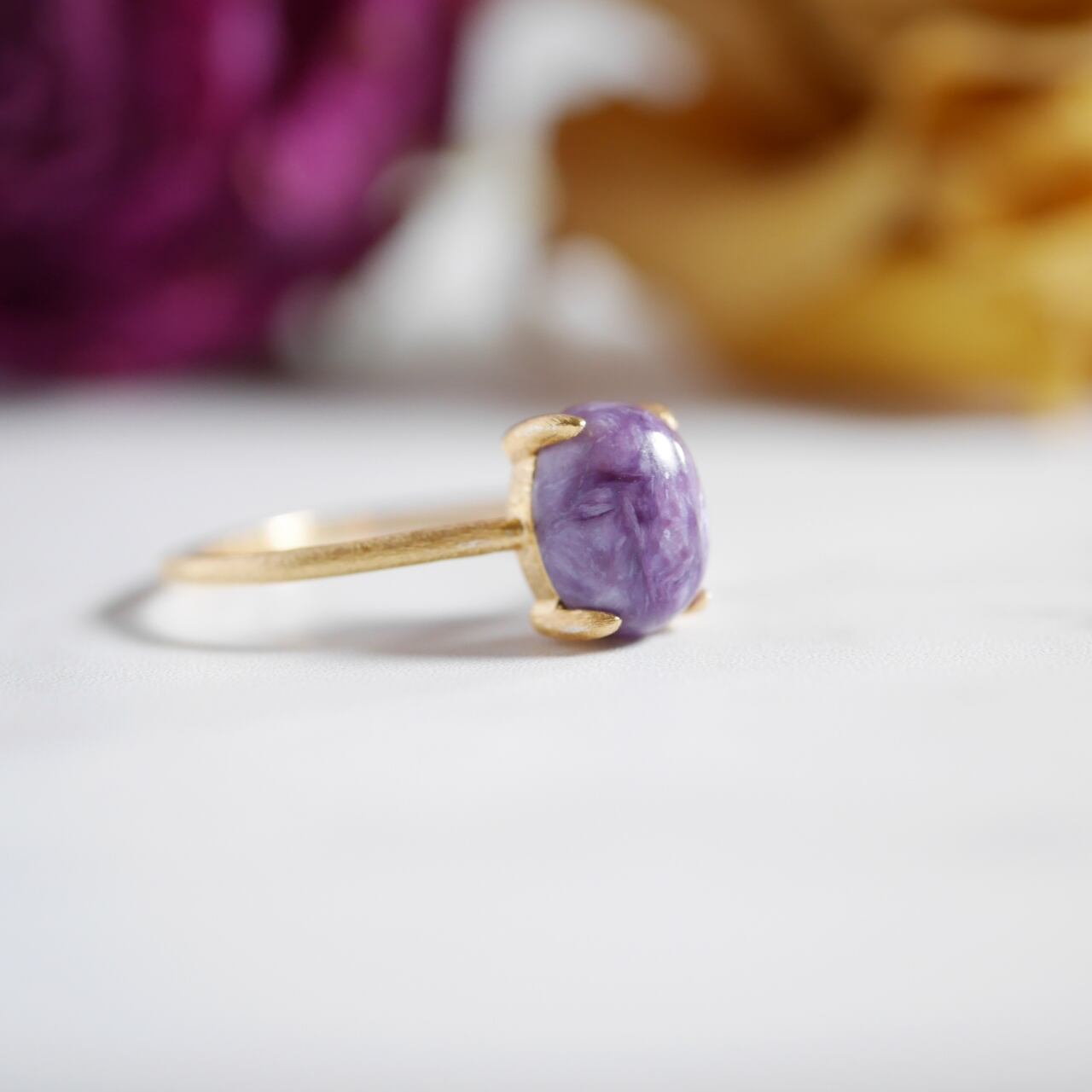 天然の模様が芸術的なチャロアイトのオーバル型リングです。