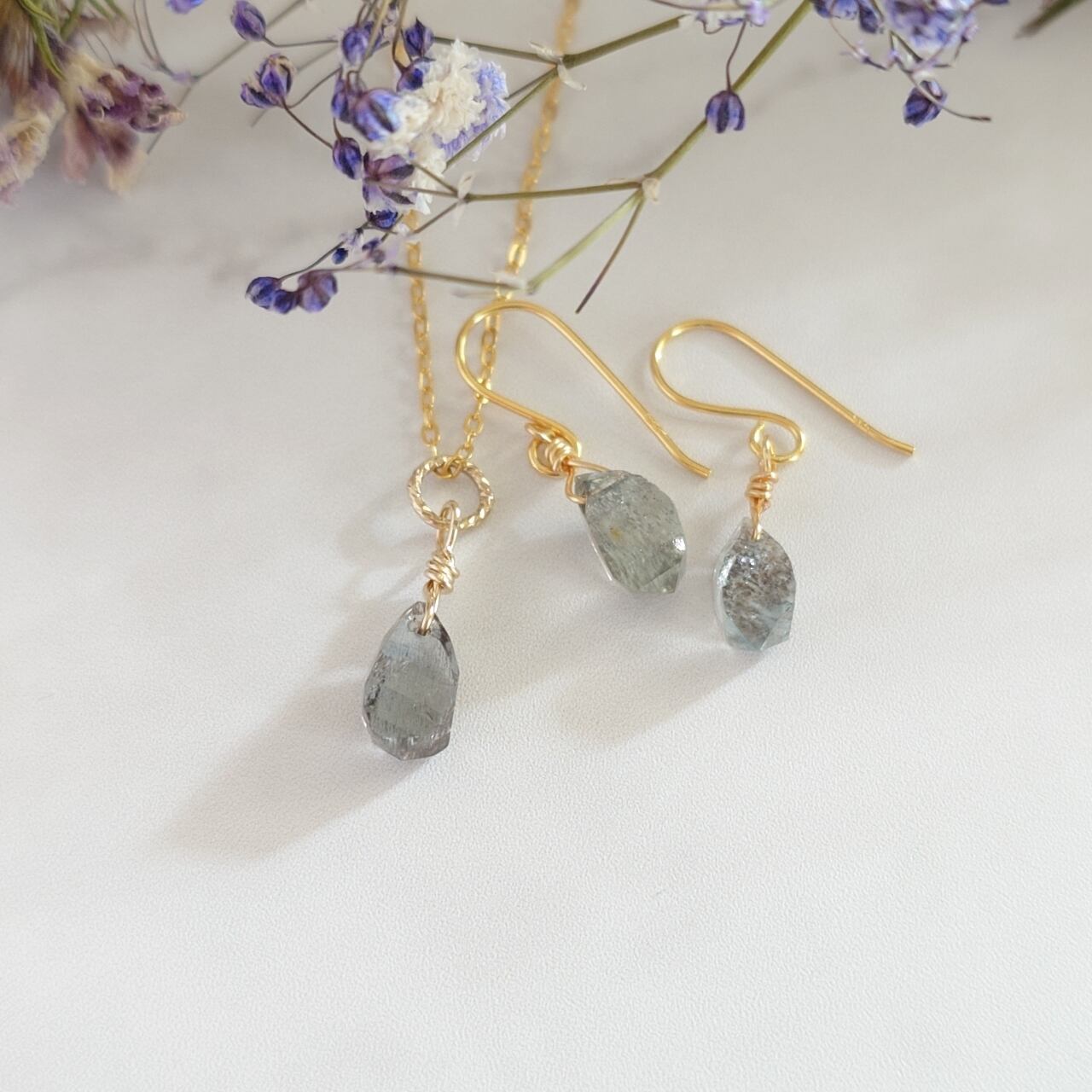 インクルージョンが美しい。モスアクアマリンのネックレス&ピアスで大人シックな装いを!