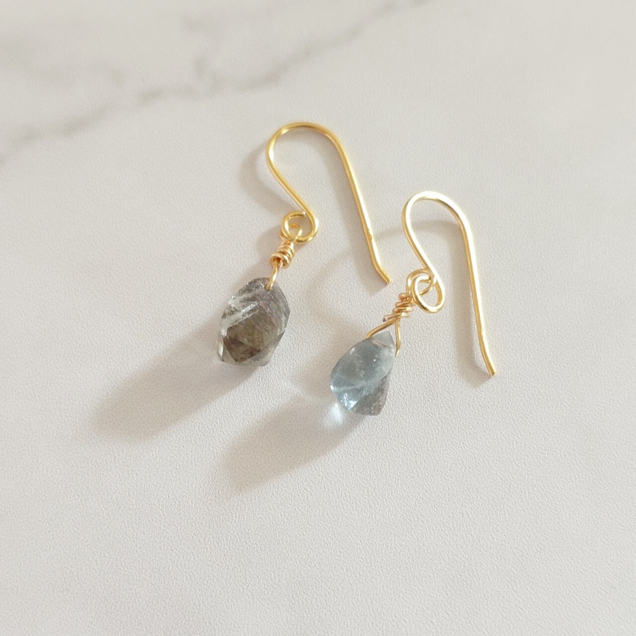 「モスグリーン ピアス No.2」は、クールなブルライトグレーに、細く繊細な針状インクルージョンが入り、見る角度によって、異なる輝きを放つピアスです。わびさびのわかる大人のような賢者の輝きが魅力です。