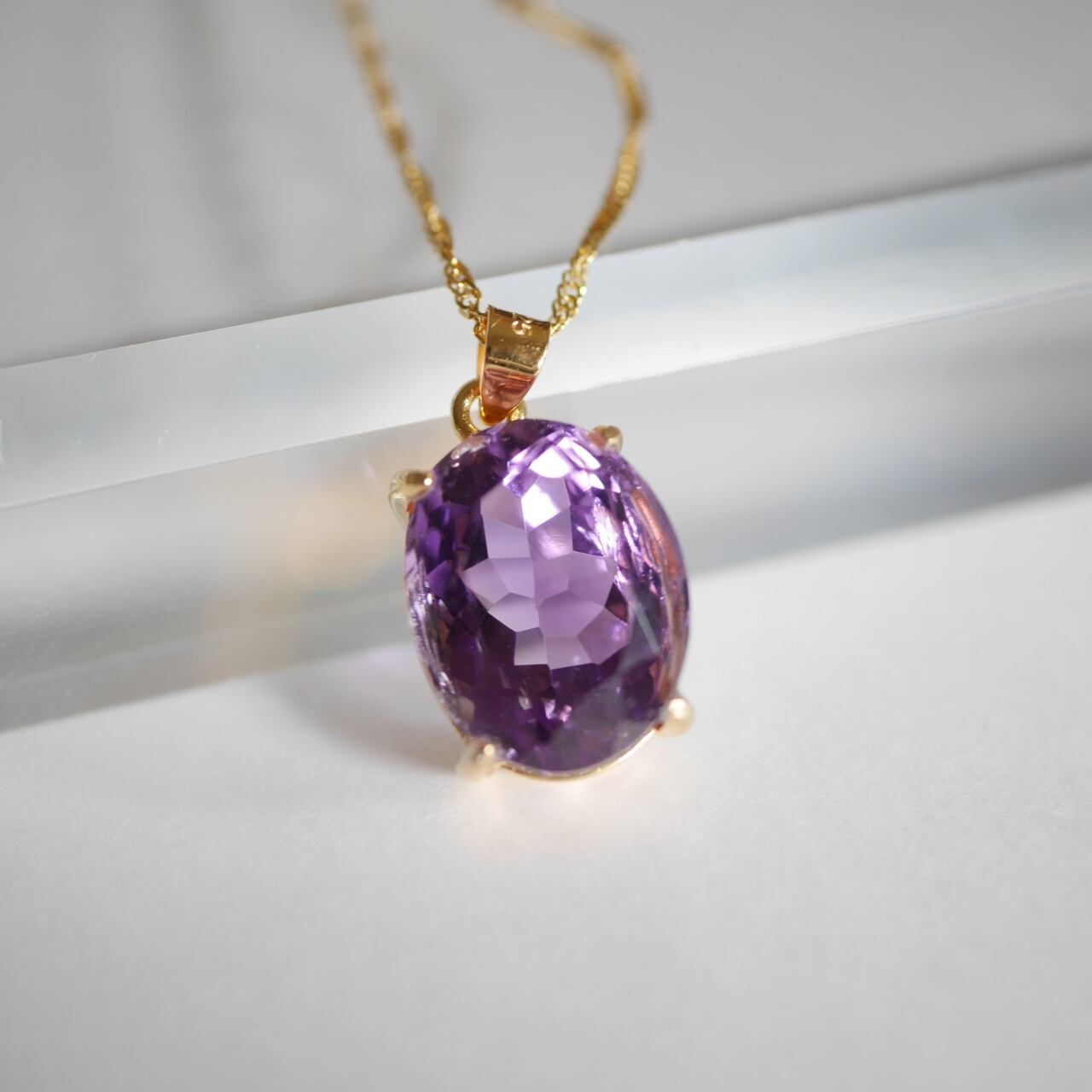 神秘的でフェミニンな優しいエネルギーに満ちたアメジストのオーバル型ネックレスです。クラス感があり、カジュアルシーンからドレスシーンまで、幅広くお使いいただけます。アメジストは、時代や世代、トレンドなどに影響されず、どんな方にも長く使っていただける天然石と言えるでしょう。