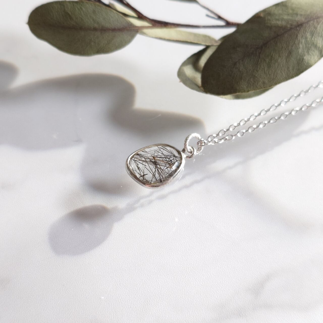 繊維状のブラックトルマリンがクォーツ(水晶)の中に閉じ込められて出来た天然の芸術的な模様をお楽しみください!ネックレスとピアスのシリーズ展開です。